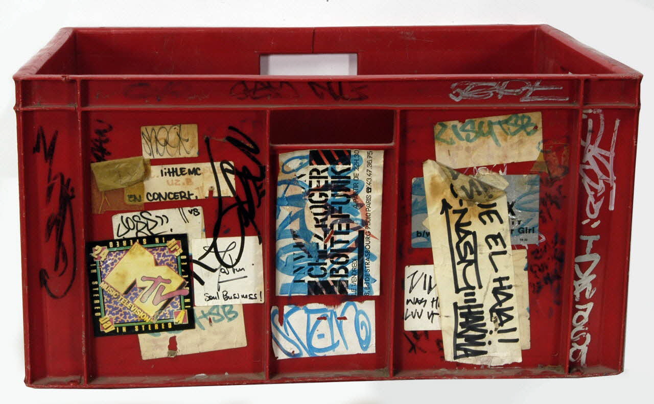 Explicit Lyrics / Side B (Sur un petit côté. Petit auto-collant blanc, rectangulaire à angles arrondis, imprimé de texte noir.), sur le côtéGANG STARR (Sur un petit côté. Auto-collant circulaire, blanc, avec au centre, un étoile sur un cercle représentant une chaine dont un maillon est visible entre chaque branche de l'étoile. Ce motif central est barré d'une inscription jaune.), sur le côté(Cette caisse est recouverte d'autocollants, collés entre 1987 et 1997.)Hip Hop Soul Party / CUT Killer / MCA & HH Production Present HIP HOP SOUL PARTY / Starring BOBBY BROWN, BRANDY, BEVERLY KNIGHT, KREUZ, MARY J. BLIGE... / Remixed By D.J. CUT KILLER / Executif Producer : Double H Production Produced By : MCA [...] (Sur un petit côté. Auto-collant carré, représentant dans des teintes bleues grises un homme debout, au centre, avec une ville avec des gratte-ciel à l'arrière plan. Une inscription rouge est présente au centre, une inscription blanche en dessous et trois logos dans le bas.), sur le côtéD.J. WARS / D.J. JEALOUS J & D.J. JOCK-D (Sur un petit côté. Auto-collant carré, orange fluo, imprimé en noir. Le début est illisible car caché sous une étiquette blanche.), sur le côtéGraffiti