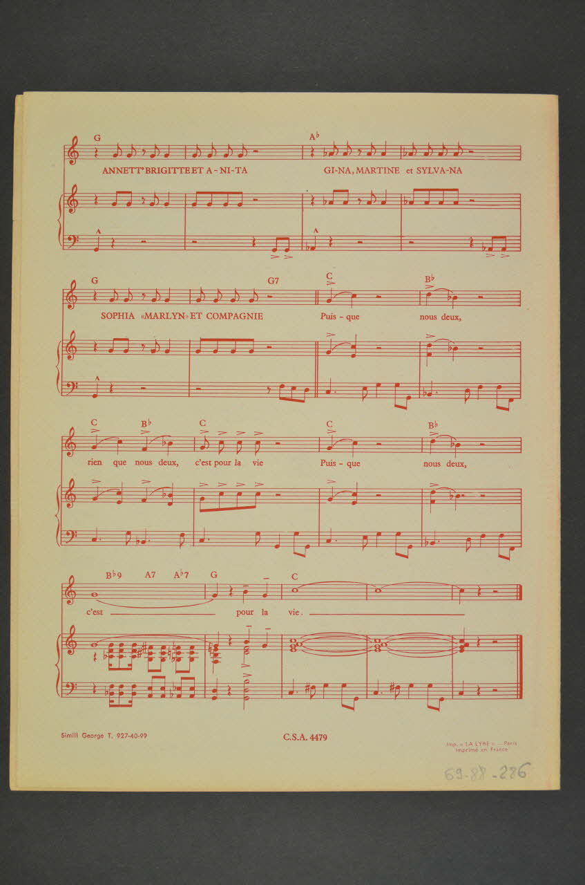 Feuillet rectangulaire en papier industriel, imprimé à l?encre rouge (sauf l?intérieur à l?encre noire). La couverture du feuillet présente la photographie des interprètes.
