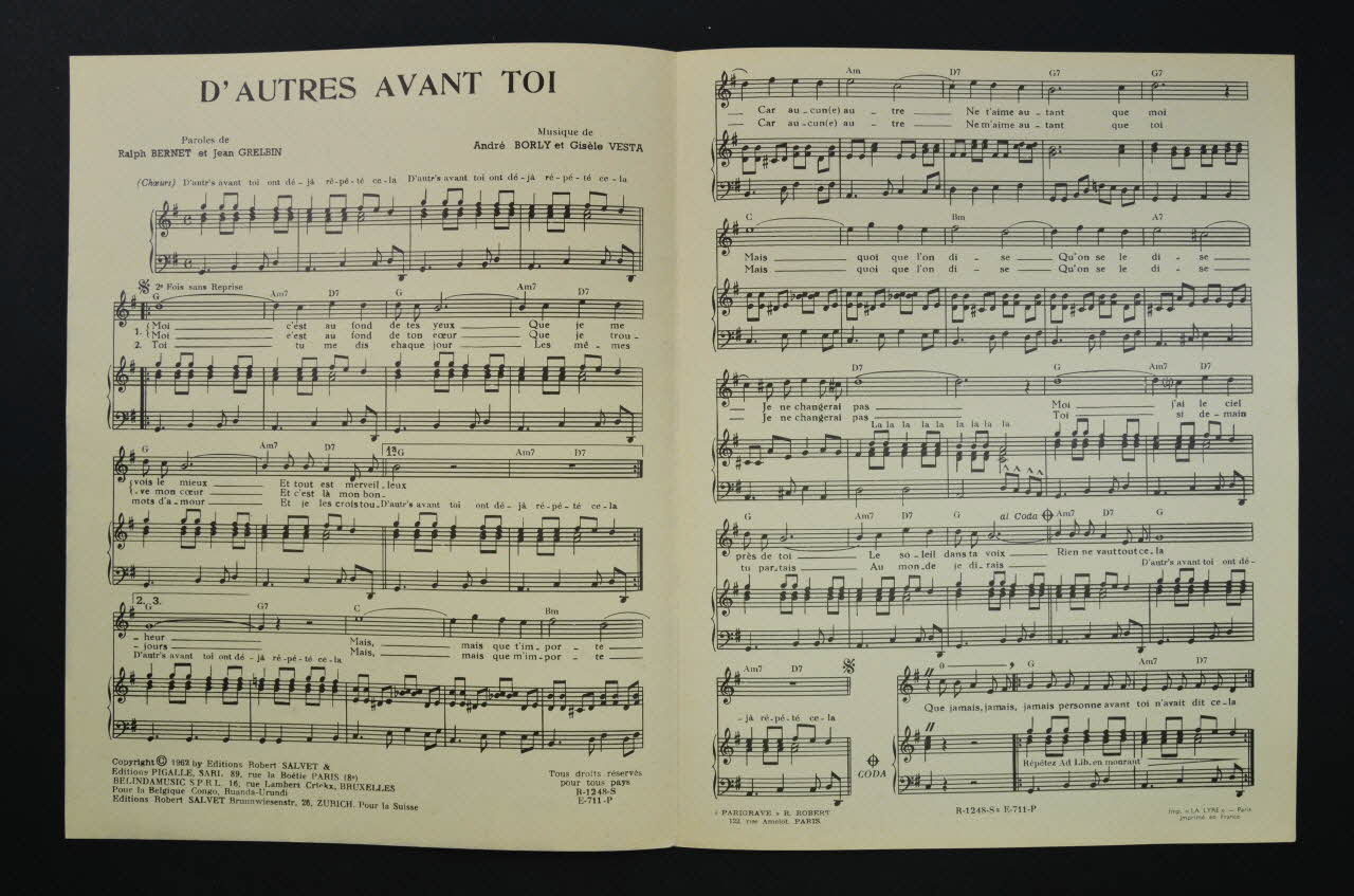 Sur la couverture, le portrait photographique des Compagnons de la Chanson, sur le toit d'un immeuble parisien. Les inscriptions renseignent le titre de la chanson, le nom des auteurs, de l'artiste et de l'éditeur. A l'intérieur, partition et paroles de la chanson. Au dos, liste d'autres partitions publiées par l'éditeur.Matériaux et techniques