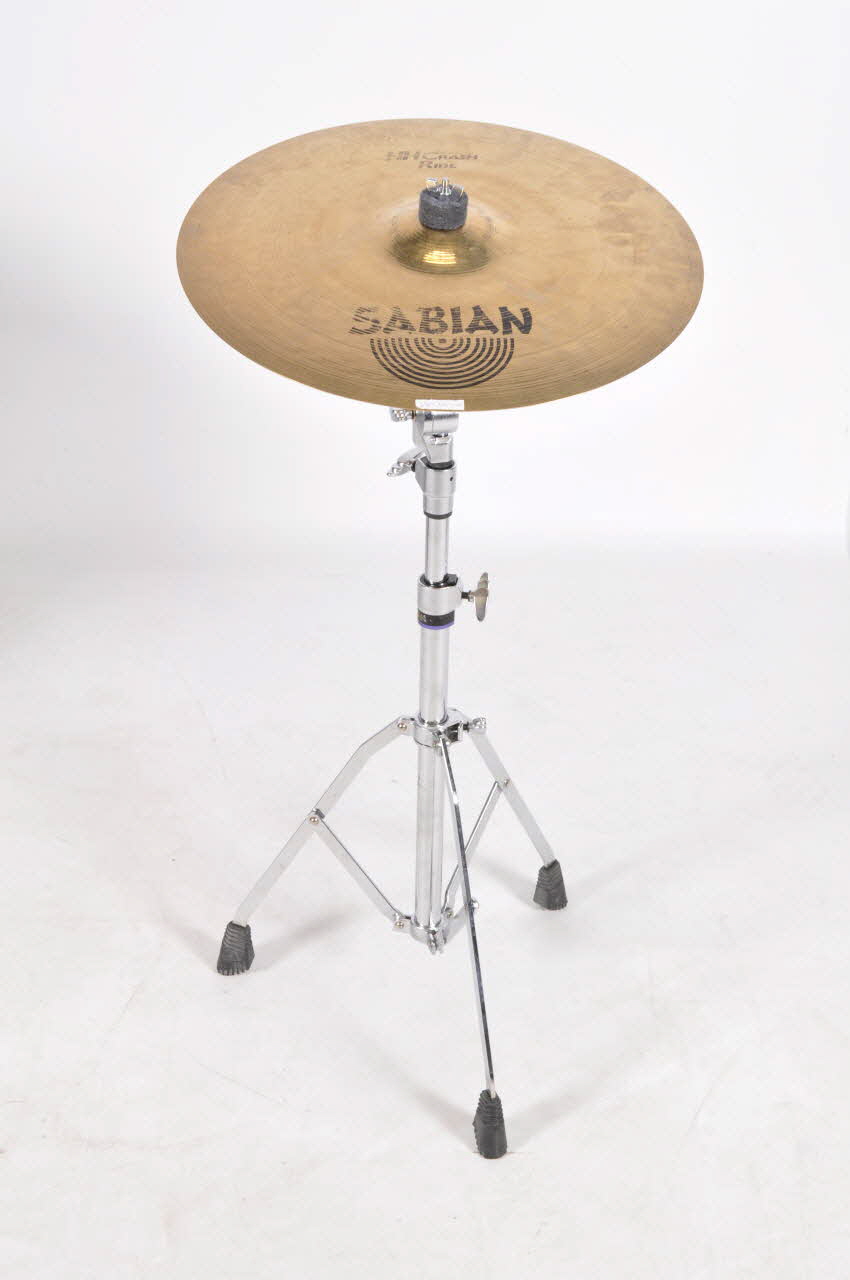 Disque de cymbale suspendue en cuivre martelé, présentant le nom de la marque imprimée sur la face suppérieure. Elle se fixe au pied 2005.200.1.11.Inscriptions