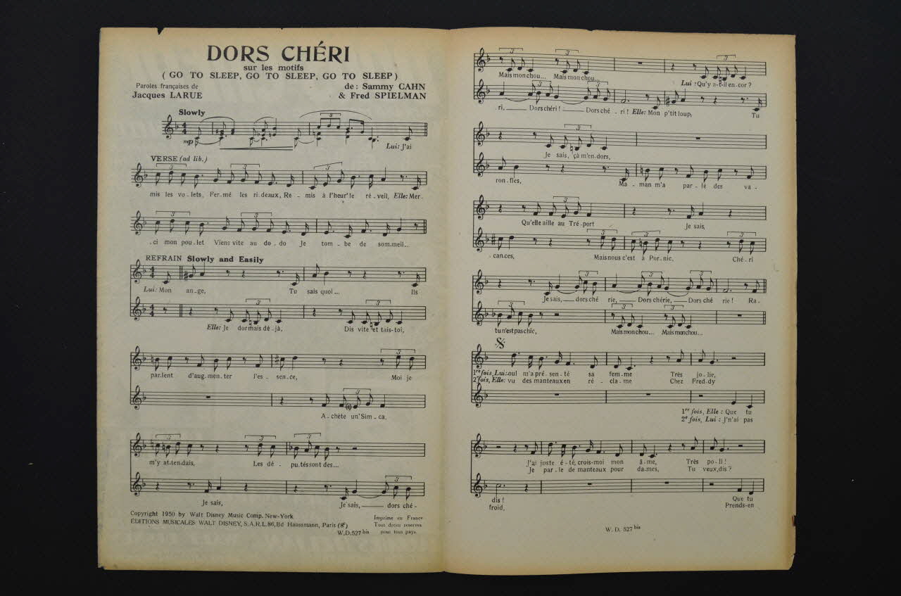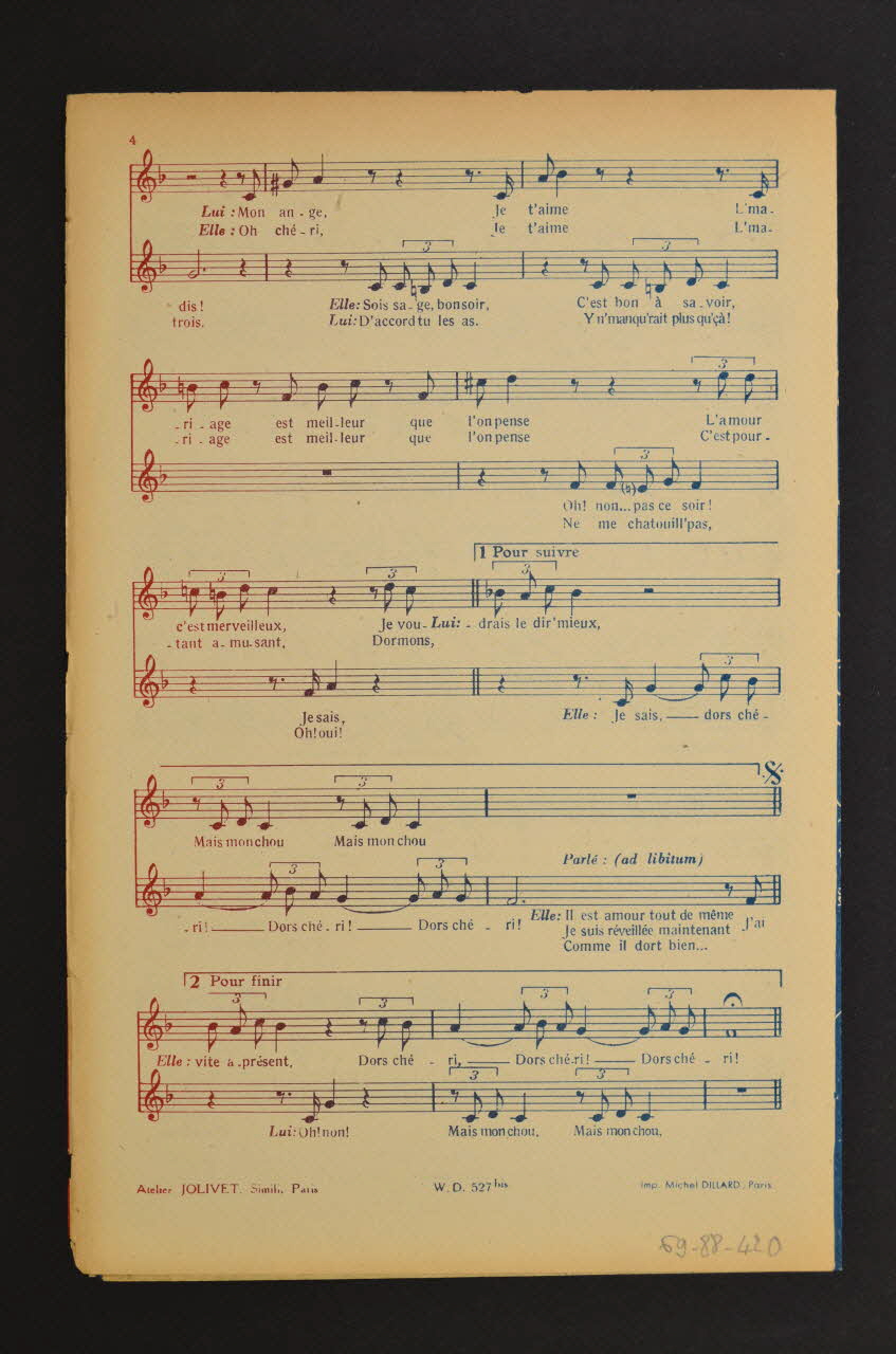 Sur la couverture, représentation d'une chambre avec table de chevet garnie d'une lampe entre deux lits où dorment des enfants ; au-dessous, les portraits photographiques de Jacques Hélian, Jean Marco et Ginette Garcin. Les inscriptions renseignent le titre de la chanson, le nom des auteurs, des artistes et de l'éditeur. A l'intérieur et au dos, partition et paroles de la chanson.Matériaux et techniques