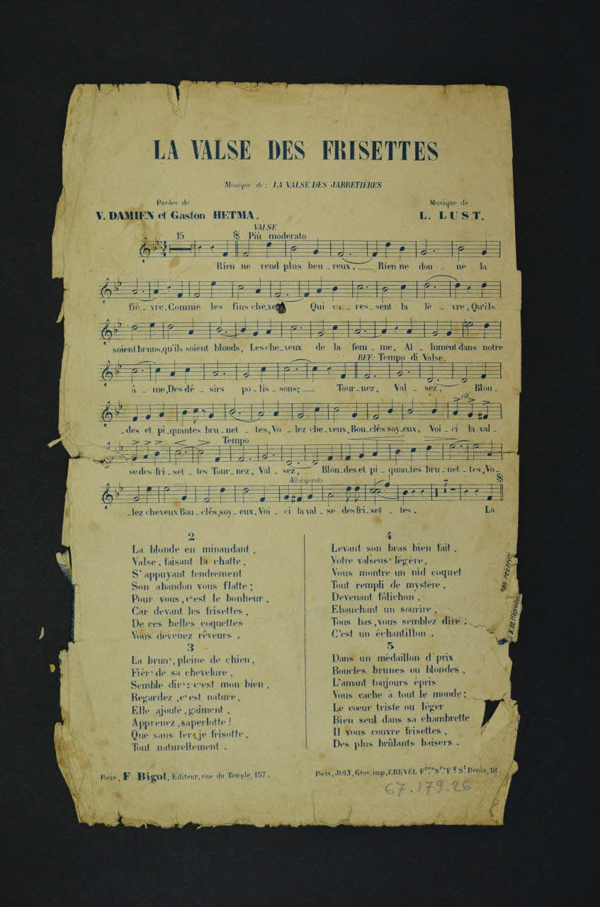 Les inscriptions précisent l'auteur de la chanson, les interprètes et l'éditeur du feuillet. L'intérieur est laissé vierge. Au dos, les paroles et la partition.Matériaux et techniques