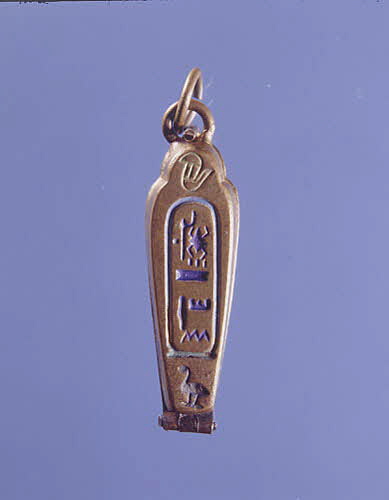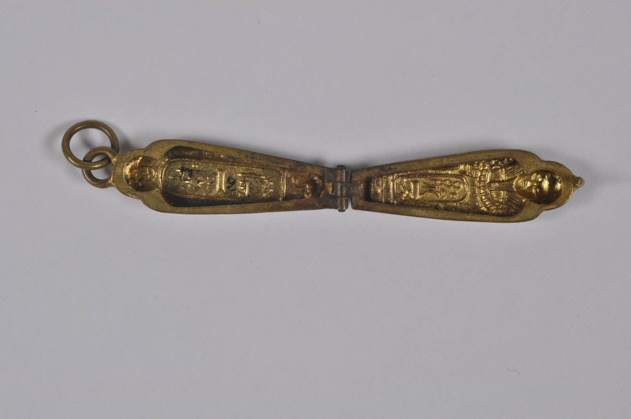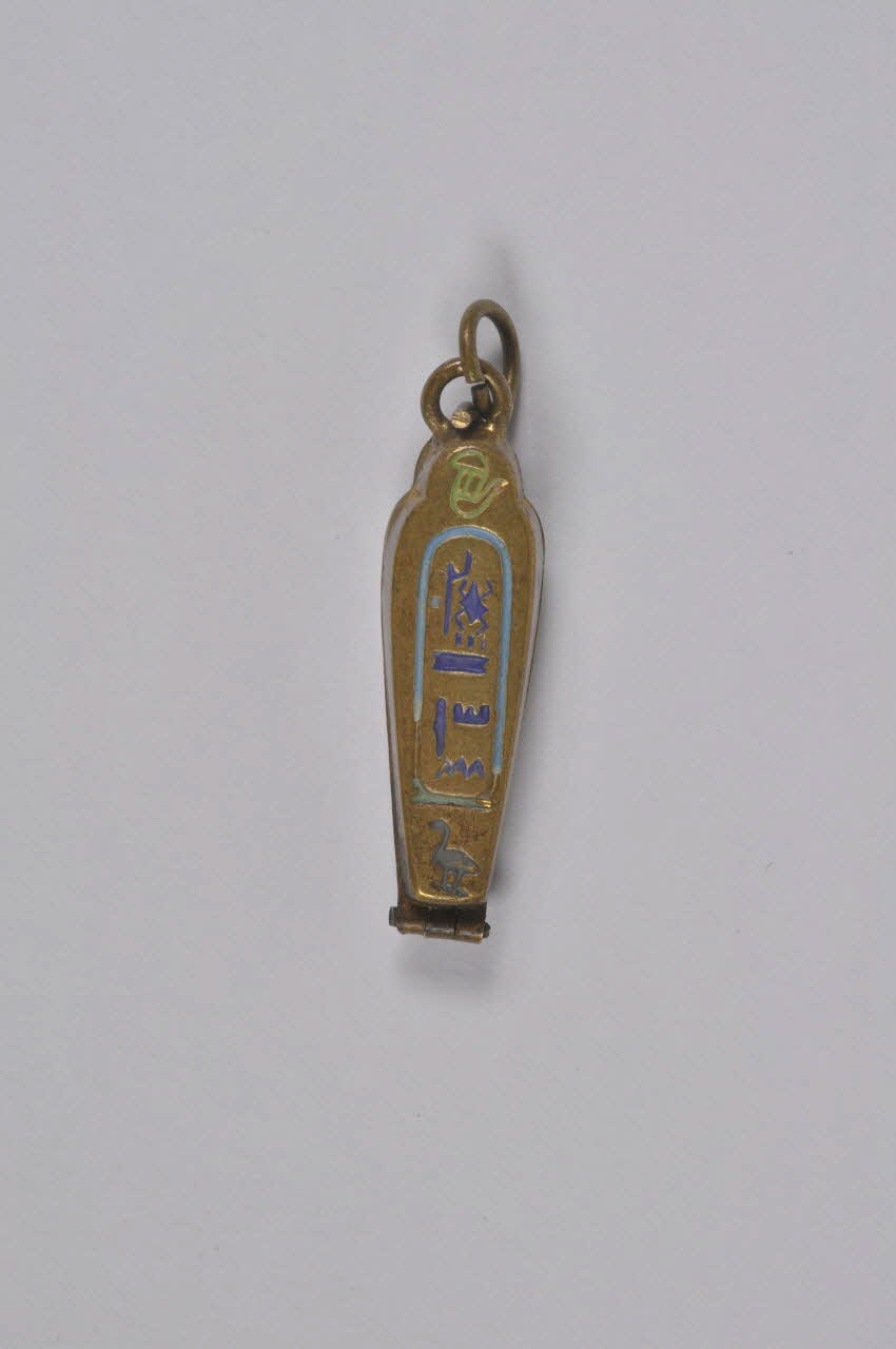Breloque en forme de sarcophage (le donateur la quaifiait de "petite momie"), avec figuration d'une momie en laiton doré émaillé bleu, rouge et vert, ouvrant par un crochet sur le haut, et une charnière à l'extrémité.