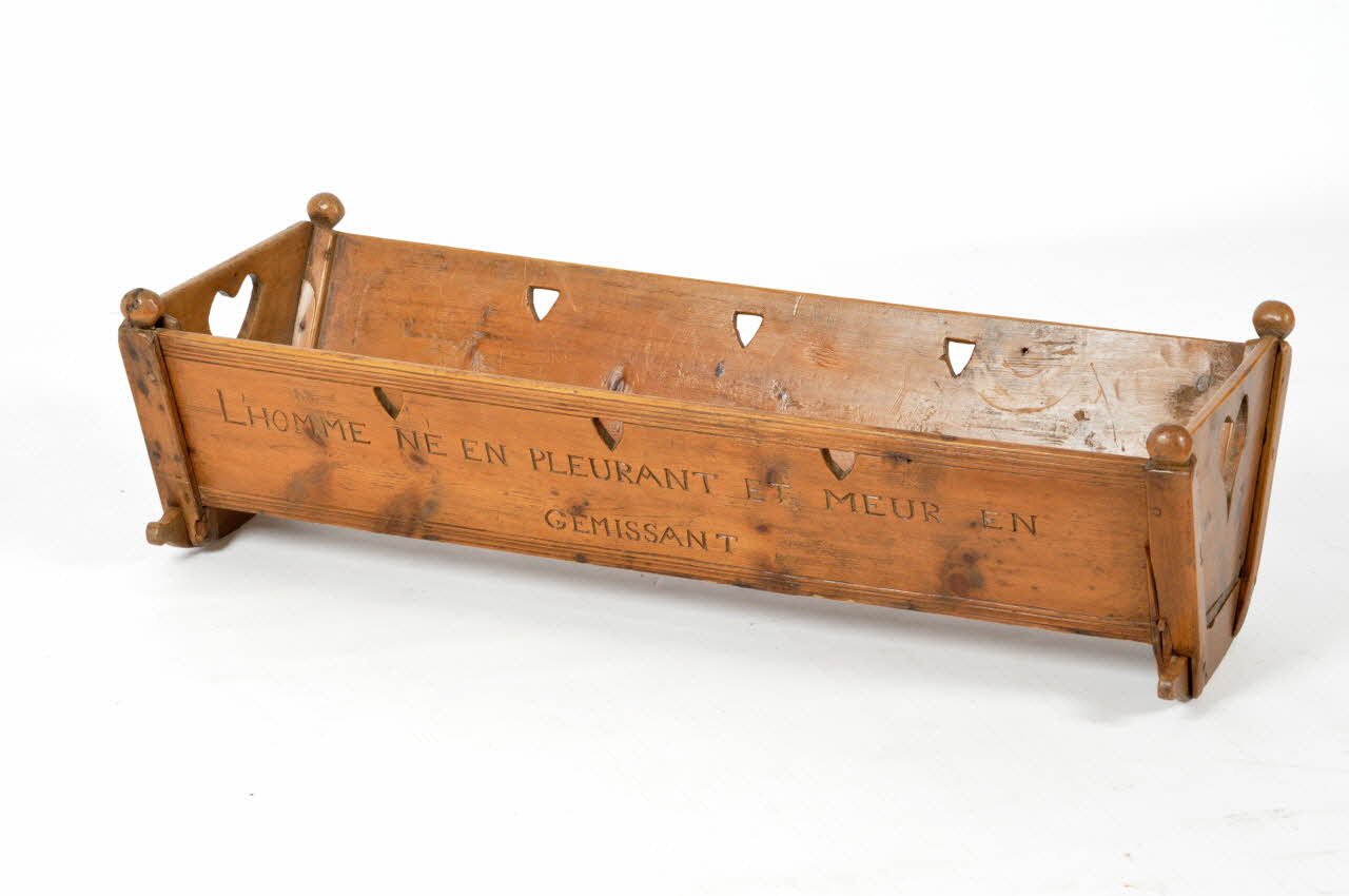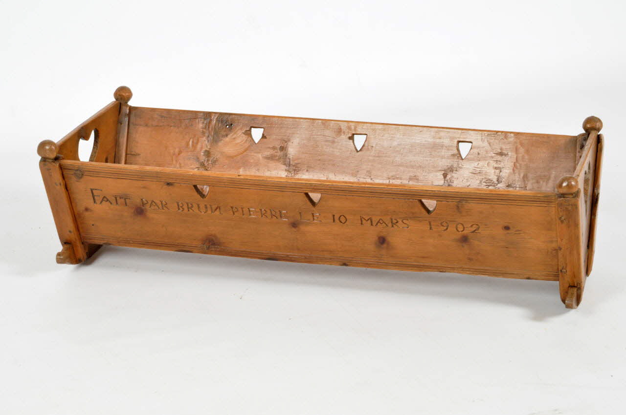 Berceau en pin d'arole taillé, mouluré, tourné, ajouré, assemblé par tenons et mortaises, chevillé.