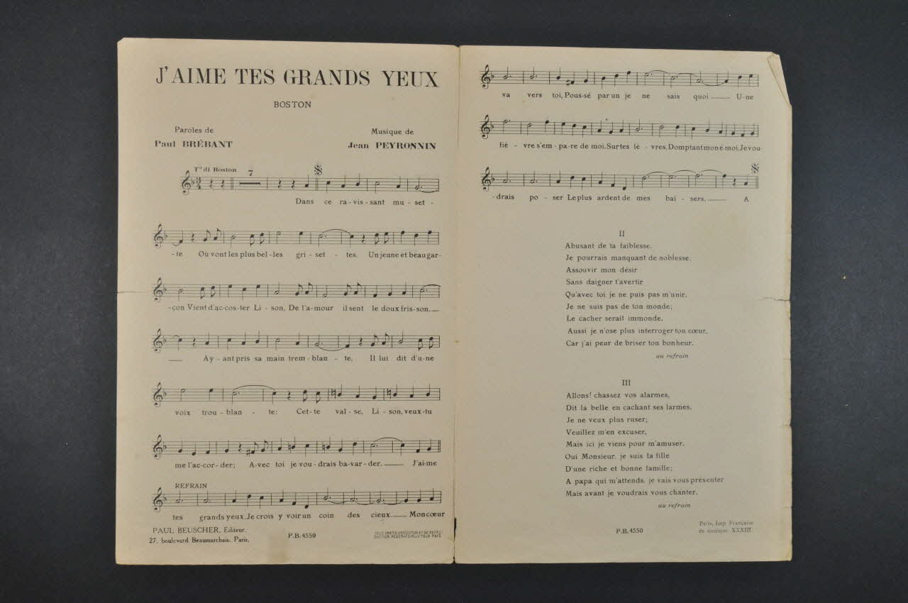 Les inscriptions précisent l'auteur de la chanson, les interprètes et l'éditeur du feuillet. L'intérieur comporte la partition et les paroles. Au dos, une liste d'autres titres disponibles chez le même éditeur.Matériaux et techniques