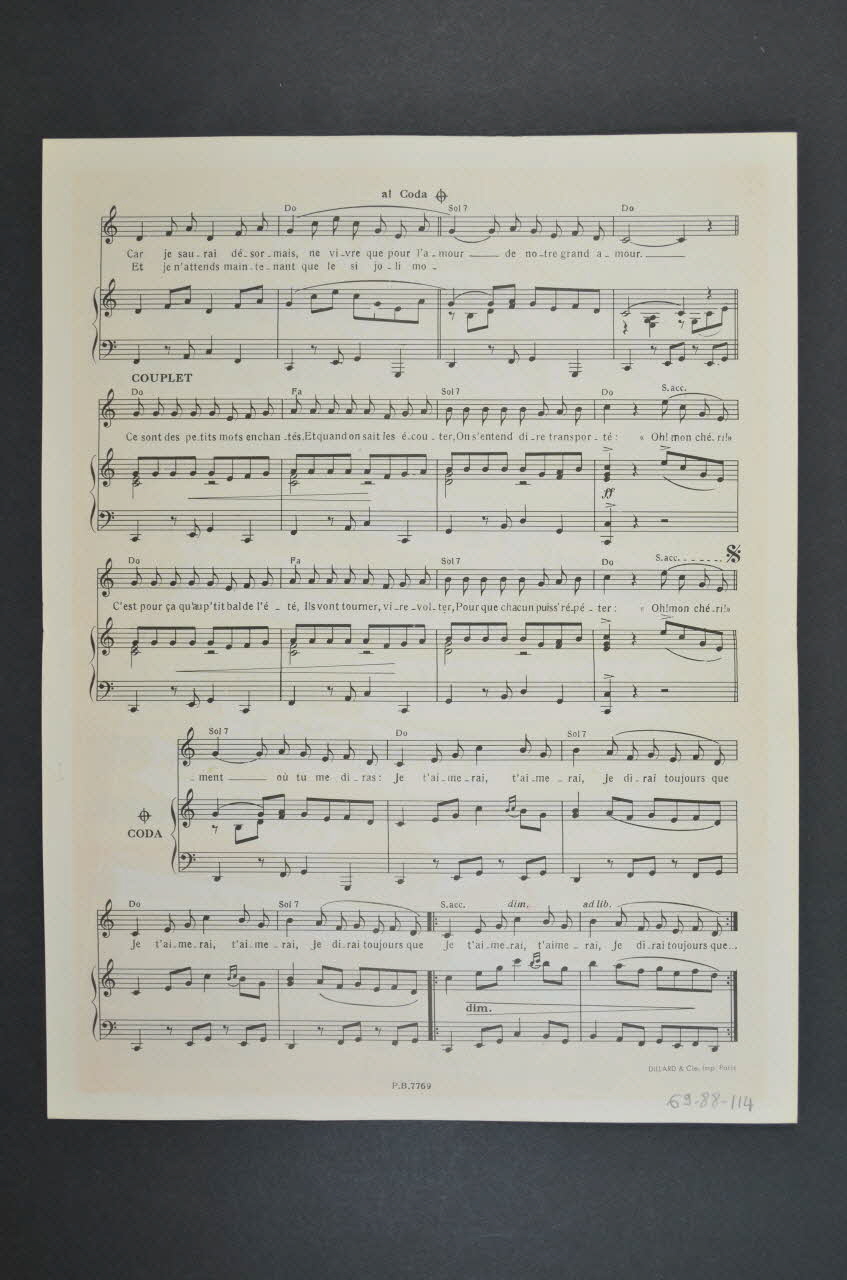 Sur la couverture, les inscriptions renseignent le titre de la chanson, le nom des auteurs, des artistes et de l'éditeur. A l'intérieur et au dos, partition et paroles de la chanson.Matériaux et techniques
