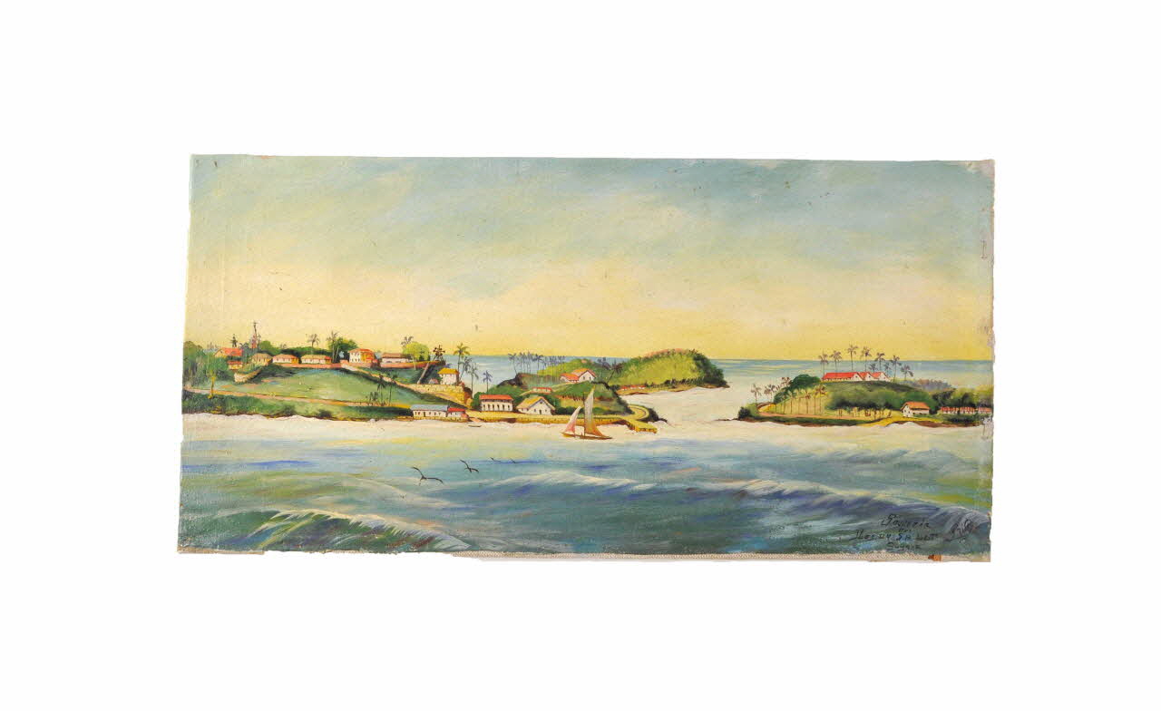 Souvenir // Des // ILes. DU SALUT. // Guyane (Il s'agit d'une inscription manuscrite à la peintre noire, elle est faite par dessus la représentation maritime. // Celle-ci se situe dans le coin inférieur droit de la toile.), en bas à droiteSignature