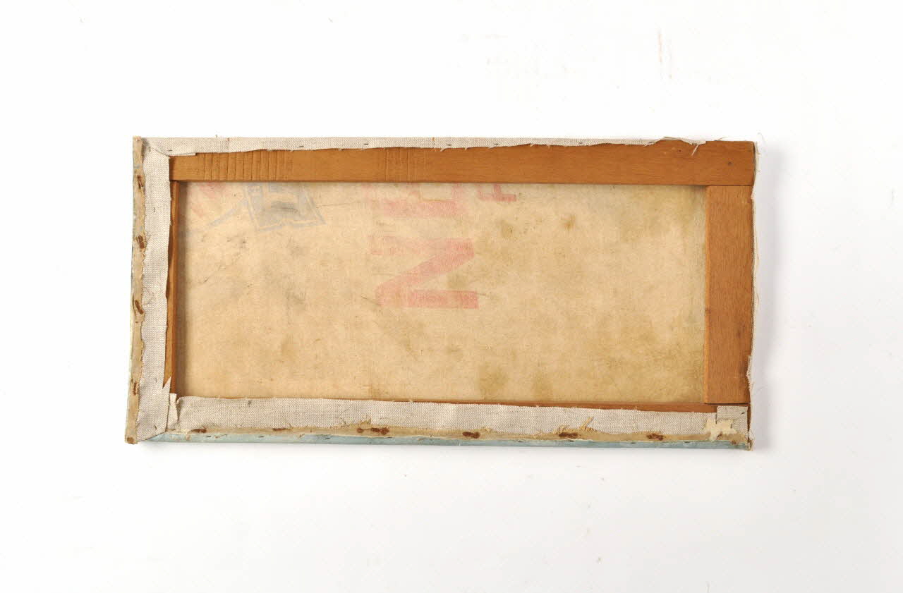 NE // F (Il s'agit d'un marquage industriel à l'encre bleu et rouge, au verso de la toile. Il s'agit probablement d'une toile de récupération.), au dosGrilly (Il s'agit d'une inscription manuscrite à la peintre noire, elle est faite par dessus la représentation maritime. // Celle-ci se situe dans le coin inférieur droit de la toile, à la droite du titre et est soulignée d'un trait.), en bas à droite(Inscription manuscrite sur le bord supérieur au dos du cadre du tableau.), au dosDécor