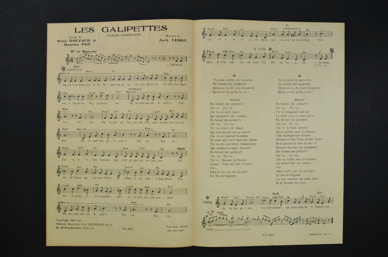Sur la couverture, les portraits photographiques de Lila Margy, Annie Cordy, Tohama, Mireille Lacoste et Lisette Jambel avec décor d'épis de blé, d'escargot, de champignons, de coccinelle, etc. Les inscriptions renseignent le titre de la chanson, le nom des auteurs, des artistes et de l'éditeur.