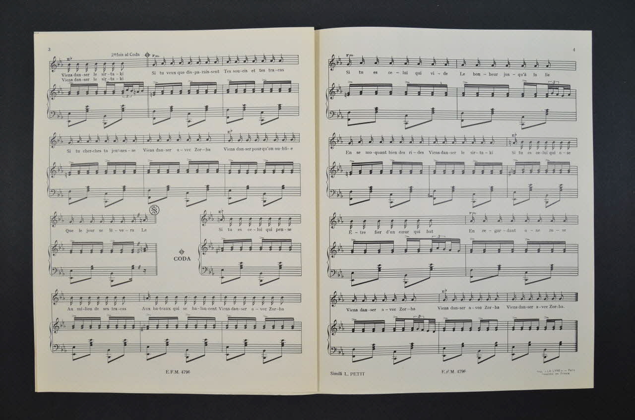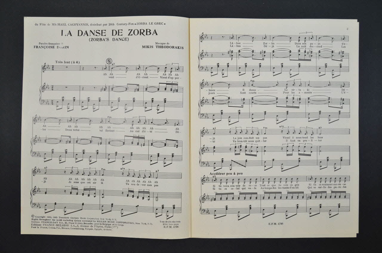 Sur la couverture, à gauche, le portrait photographique de Johnny Dalida, passant sa main dans ses cheveux ; à droite, sous le titre du film, une représentation d'Anthony Quinn dansant le sirtaki. Les inscriptions renseignent le titre de la chanson et du film, le nom des auteurs, de l'artiste et de l'éditeur.