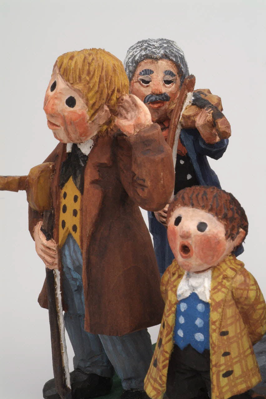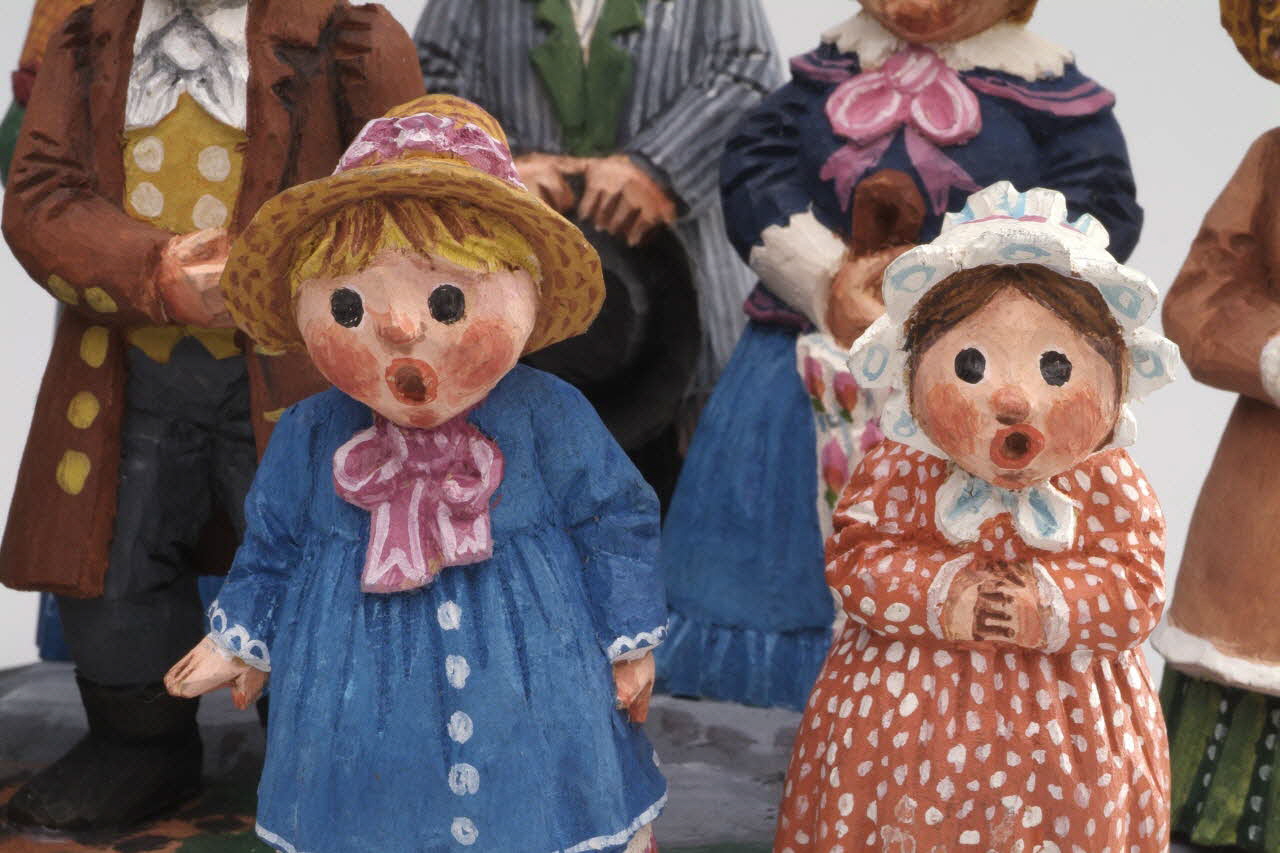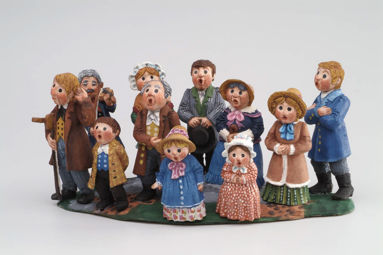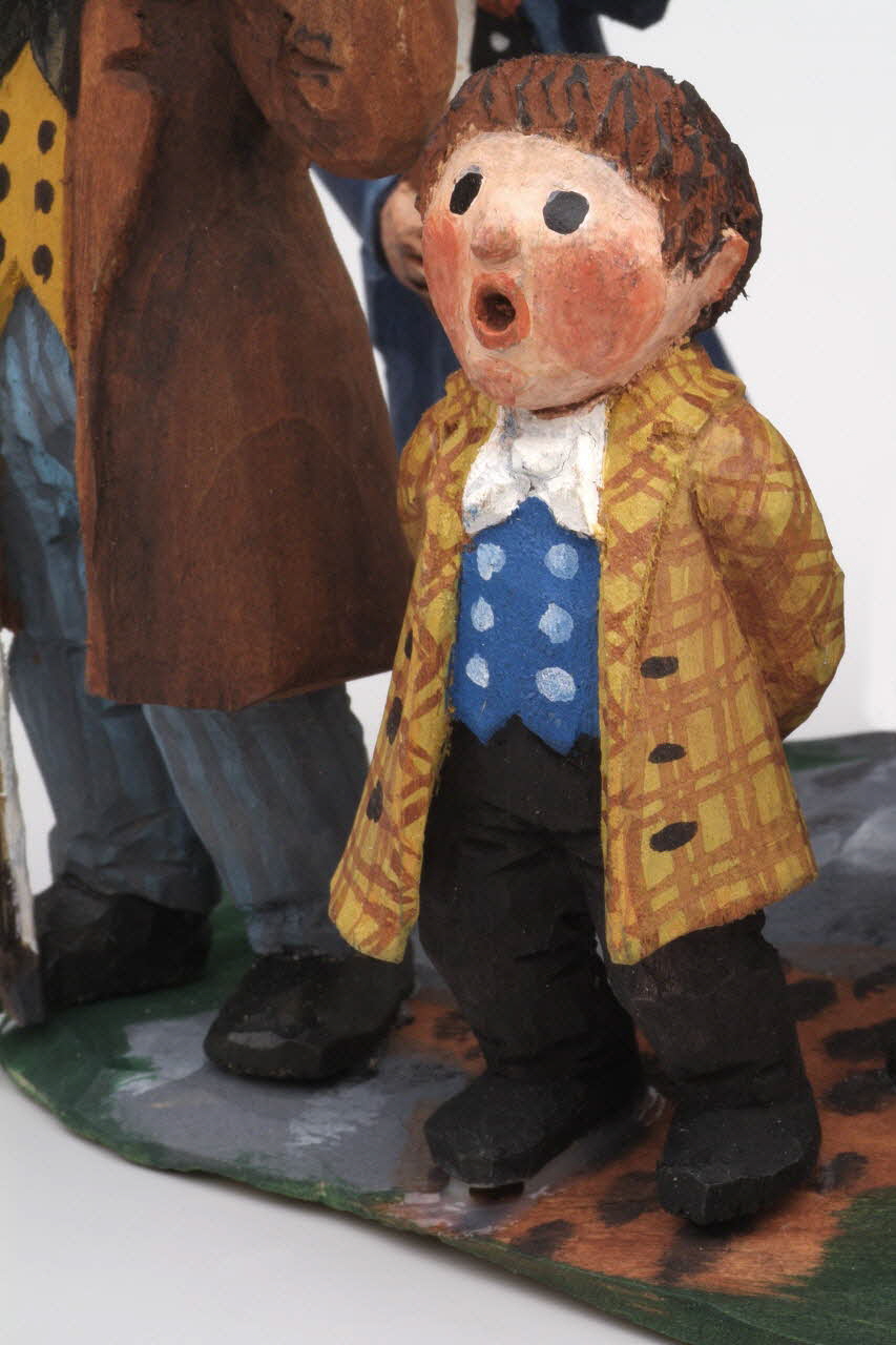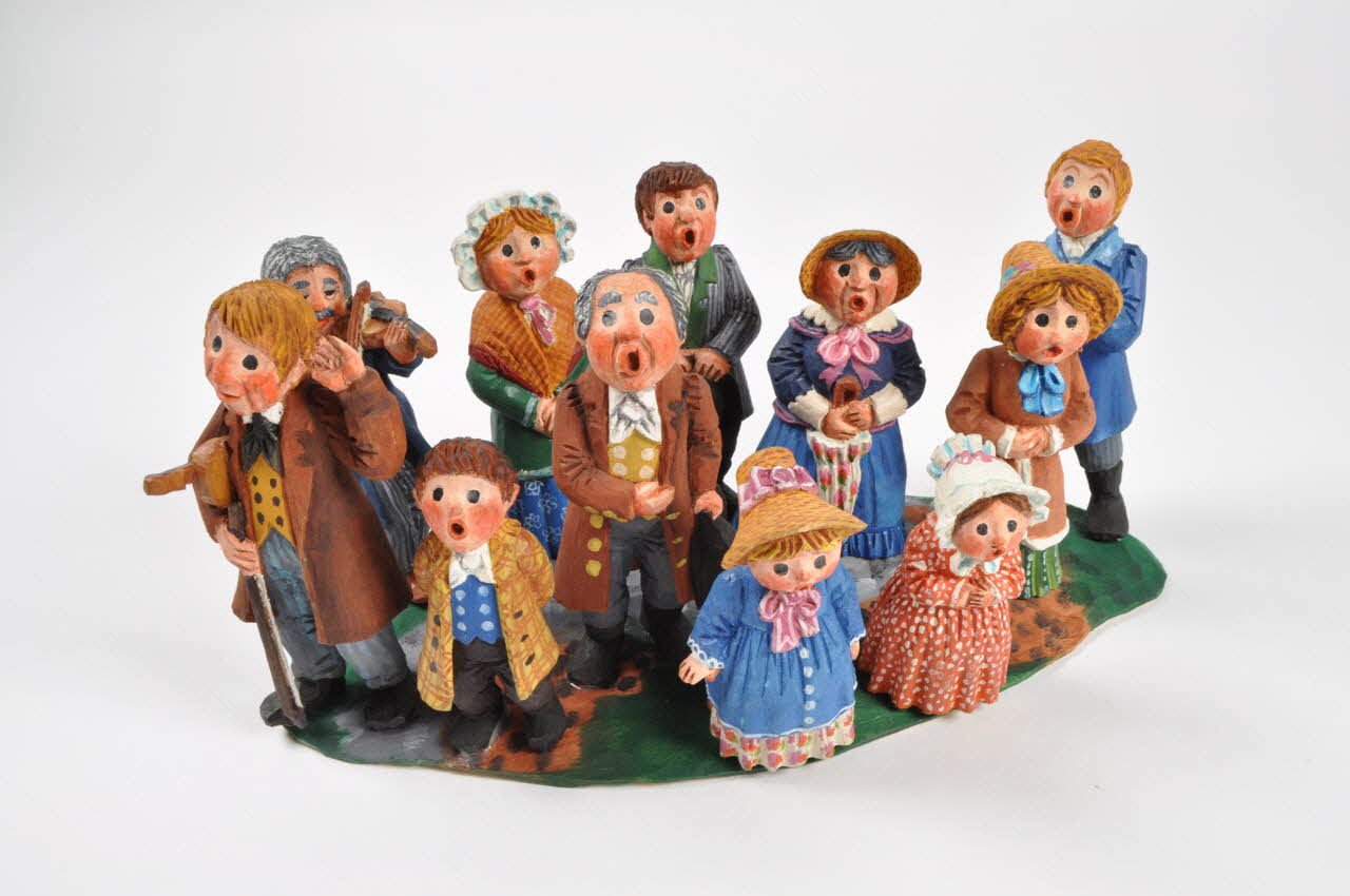 Groupe en bois de tilleul taillé et peint. Chorale de onze personnes chantant : deux violonistes, trois femmes, trois hommes et trois enfants, vêtus en citadins du dix-neuvième siècle.Décor