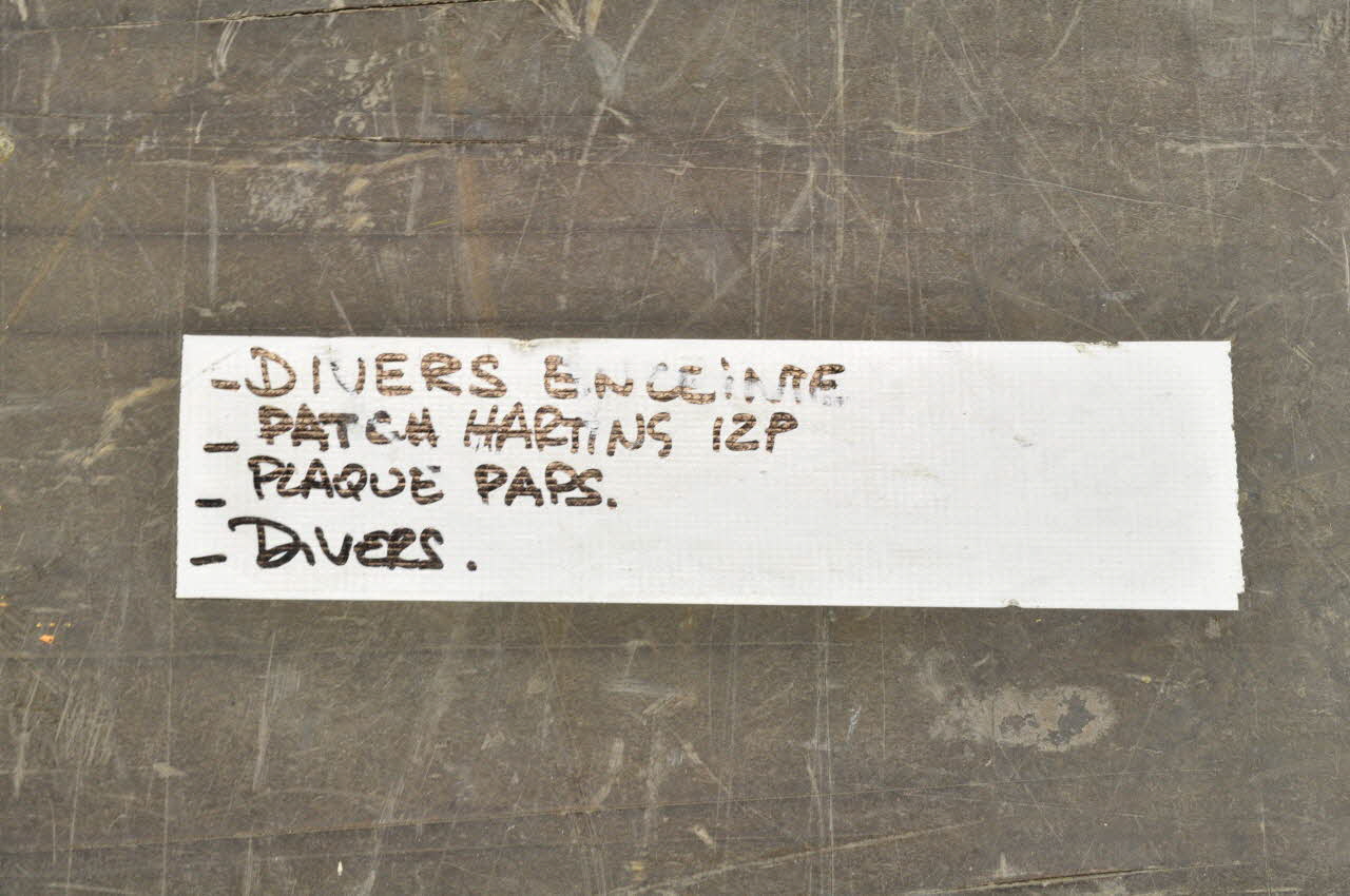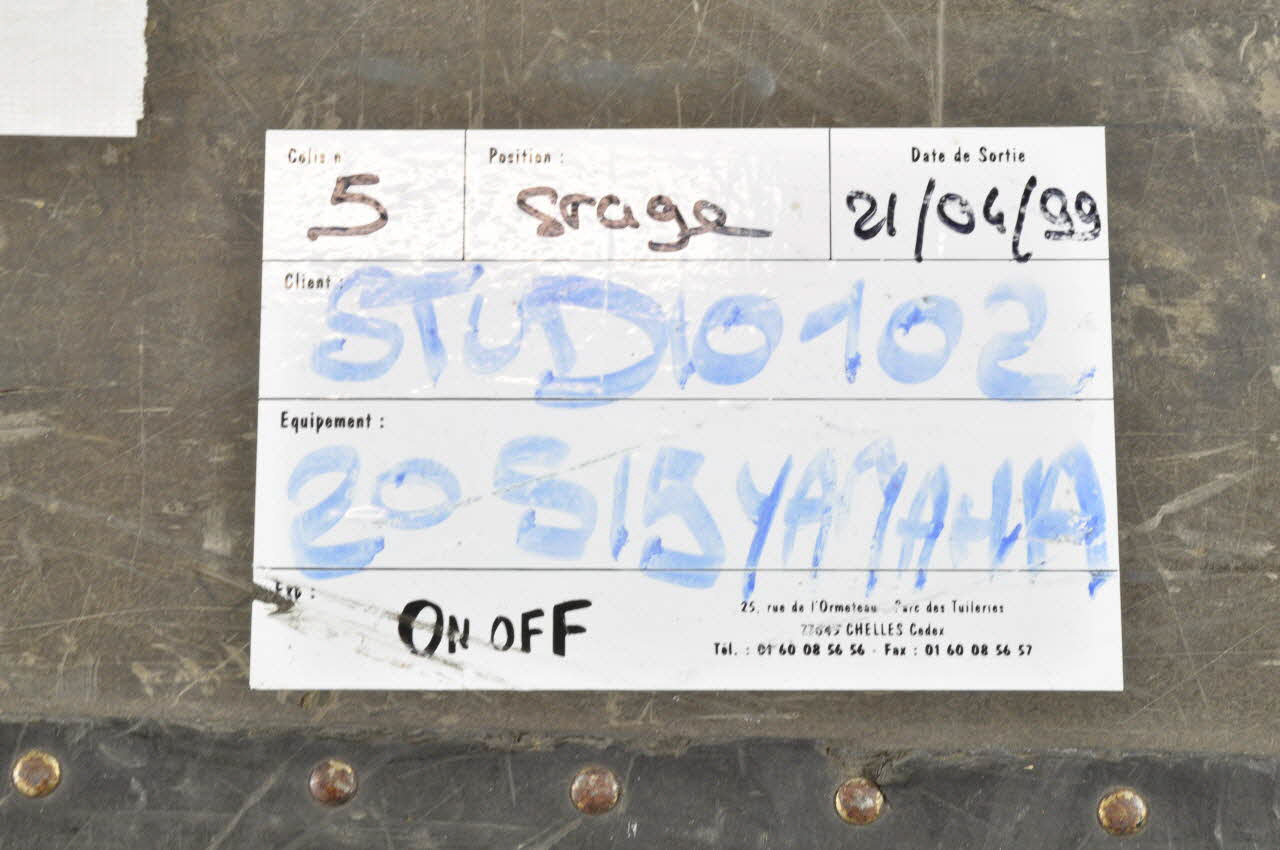 colis n° 5 / Position : STAGE / Date de sortie / 21/04/99 / Client: STUDIO 102/ Destination: 20515 YAMAHA / Exp: ON-OFF/ 2, rue Emile Zola 77450 MONTFRY Tél: 64 63 57 94 - Fax: 64-63-57-95 (étiquette pour le transport sur le .2), sur le côtéImprimé