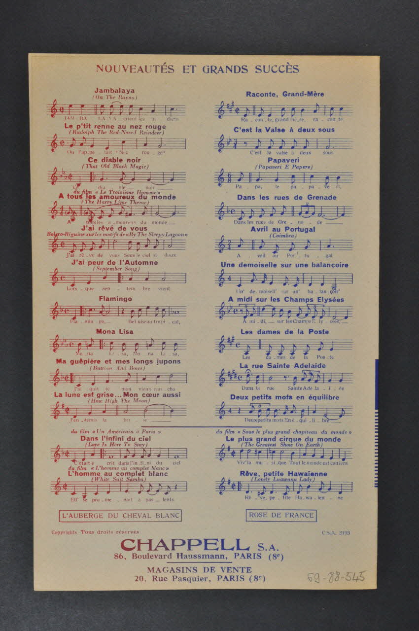 La première page présente la photographie de Georges Guétary. Les inscriptions précisent le titre de la chanson, l'auteur et l'éditeur. A l'intérieur se trouvent la partition et les paroles de la chanson. Au dos, une liste de morceaux disponibles chez le même éditeur.Matériaux et techniques