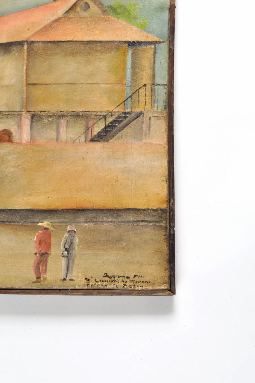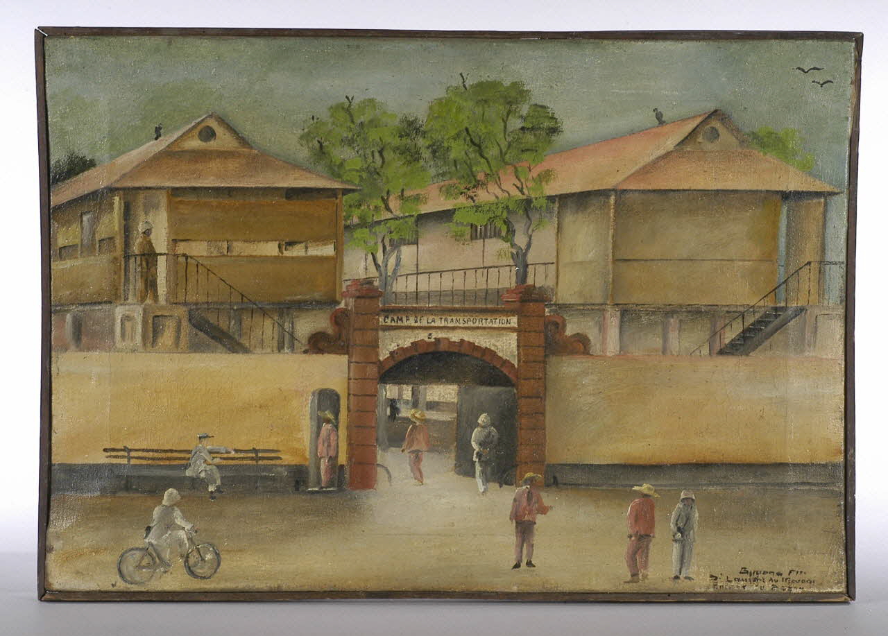 Une baguette en bois encadre le châssis. Le tableau représente des personnes devant l'entrée du camp de la transportation à Saint-Laurent-du-Maroni. Au premier plan, on reconnaît des bagnards vêtus de chapeaux et uniformes rouge ou gris. Sur la gauche, un homme arrive à bicyclette et un second discute avec un bagnard, assis sur un banc. Au second plan, derrière le mur d'entrée, sont visibles deux grandes cases du bagne.Inscriptions