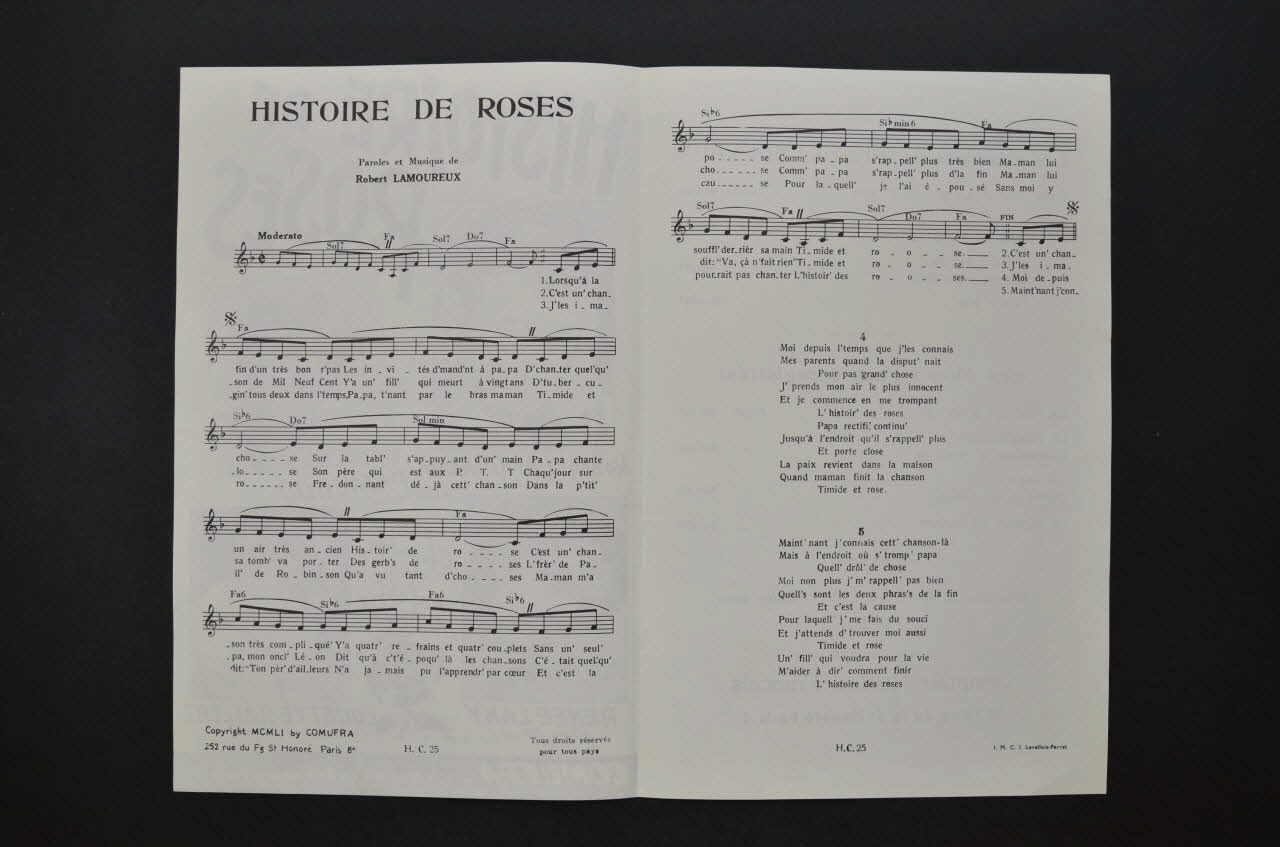 Sur la couverture, les portraits photographiques de Robert Lamoureux, Patachou, Renée Lamy et Lucette Raillat ; au centre de la partie inférieure, entre deux portraits, représentation stylisée d'une rose. Les inscriptions renseignent le titre de la chanson, le nom des auteurs, des artistes et de l'éditeur.