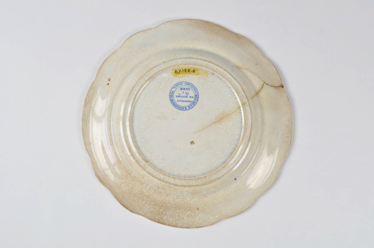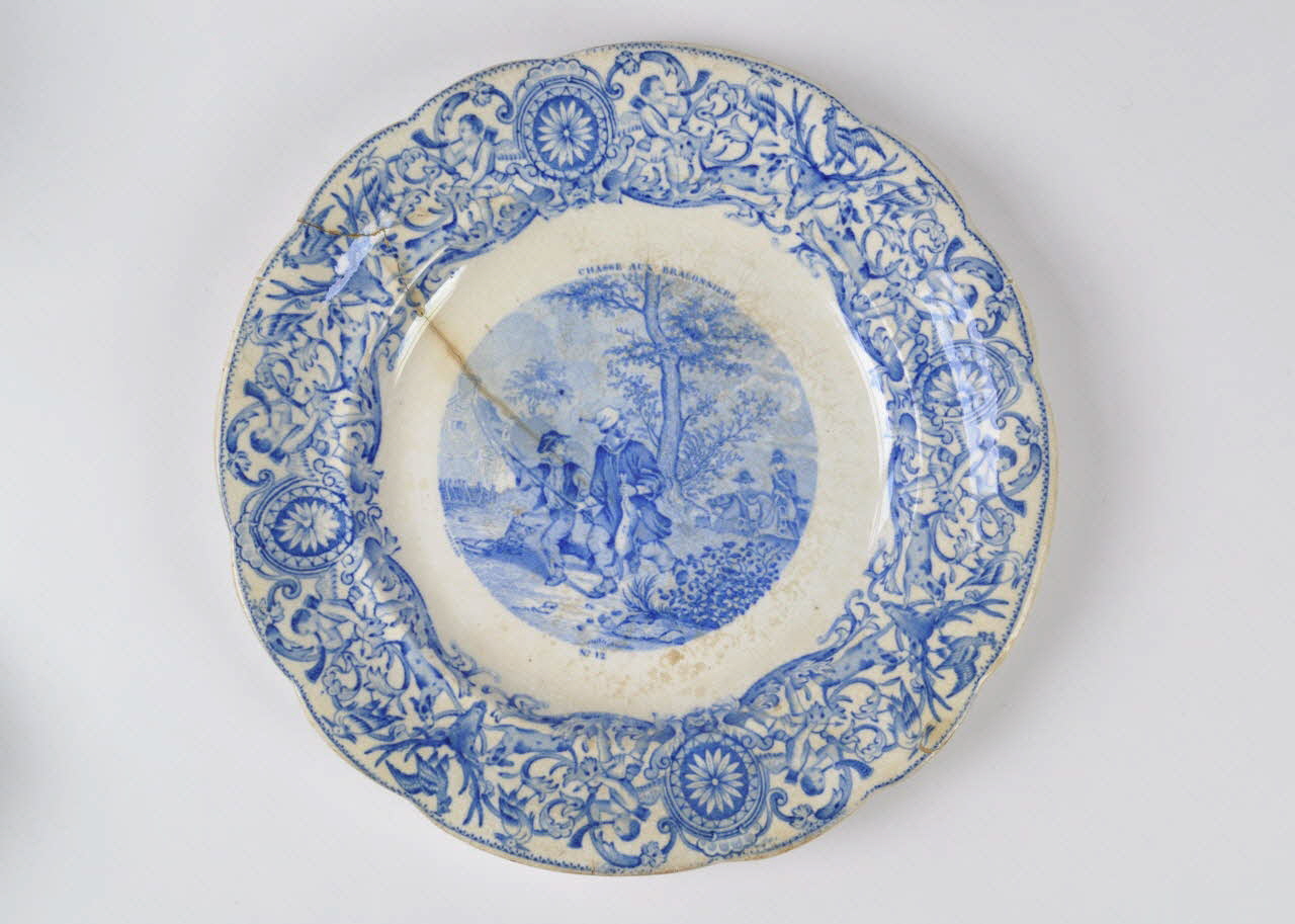 Faïence fine, calibrée, tournasée, à décor imprimé, peint en bleu, à poinçon au verso / A bords bas, évasés, légèrement chantournés. Sur le Marli : angelots avec carquois, flèche, trompe alternent avec des medaillons, oiseaux, chiens au fond, médaillon avec inscription "chasse aux braconniers n. 12' dans un paysage, au premier plan : deux hommes dont l'un en costume de nuit, tient un lapin et un fusil. Ils s'enfuient devant deux gendarmes à cheval. Au verso "médaille exposition 1844. Geoffroy de boulen, Gien".Inscriptions