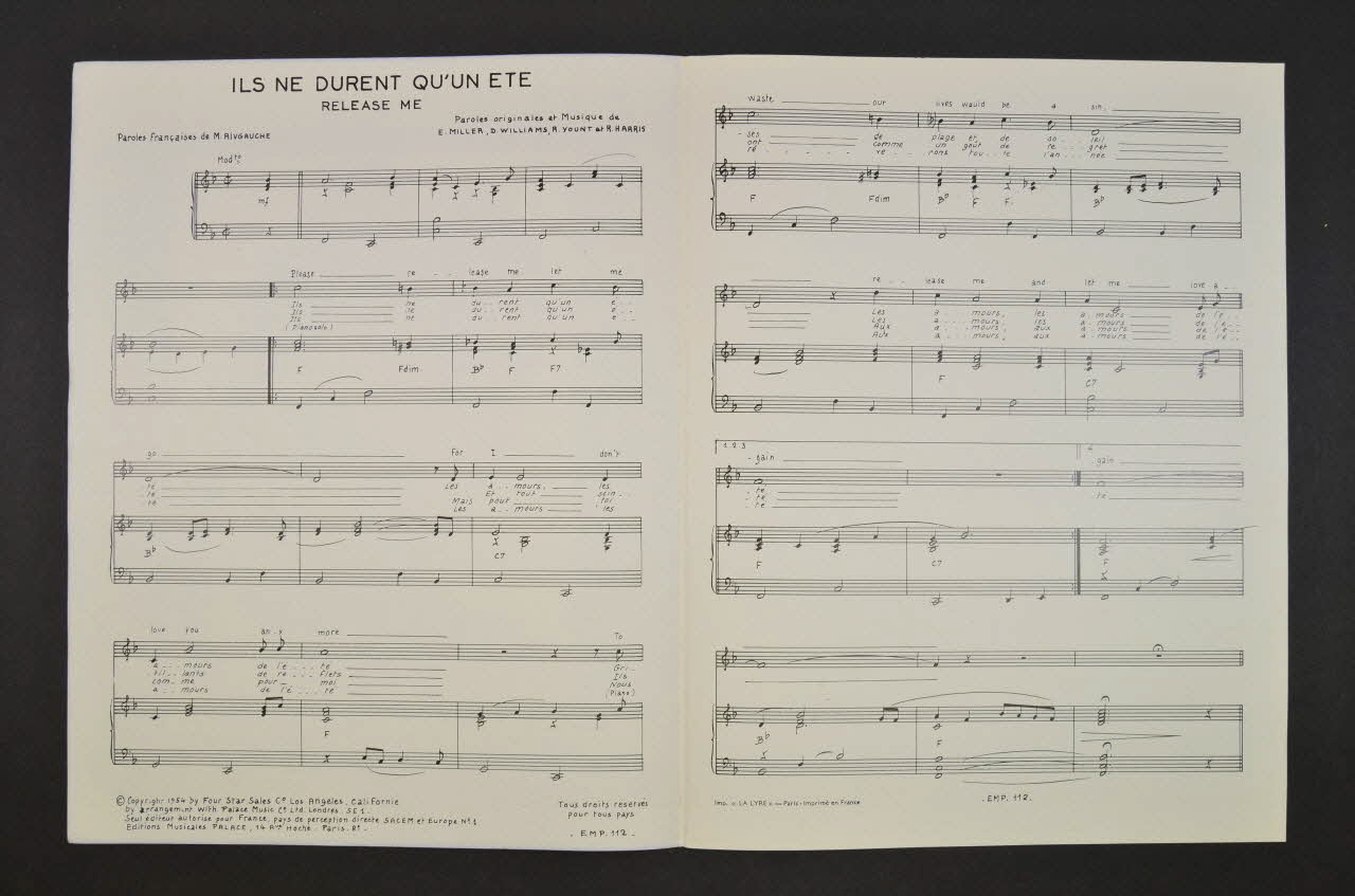 Les inscriptions renseignent le titre de la chanson, le nom des auteurs, de l'artiste et de l'éditeur. A l'intérieur, partitions et paroles de la chanson. Le dos est laissé vierge.Matériaux et techniques