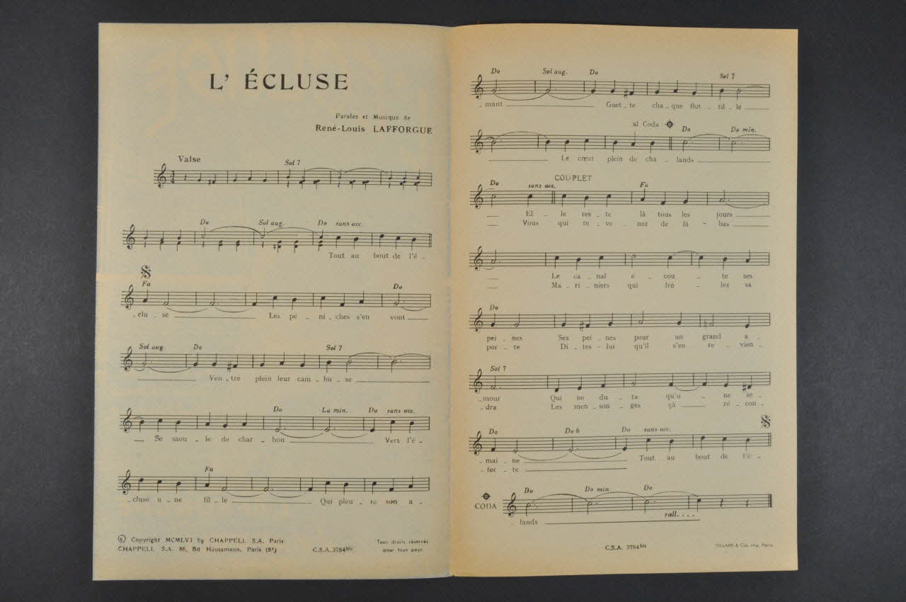 La première page présente la photographie de R-L Lafforgue. Les inscriptions précisent le titre de la chanson, l'auteur et l'éditeur. A l'intérieur se trouvent la partition et les paroles de la chanson. Au dos, une liste de morceaux disponibles chez le même éditeur.Matériaux et techniques