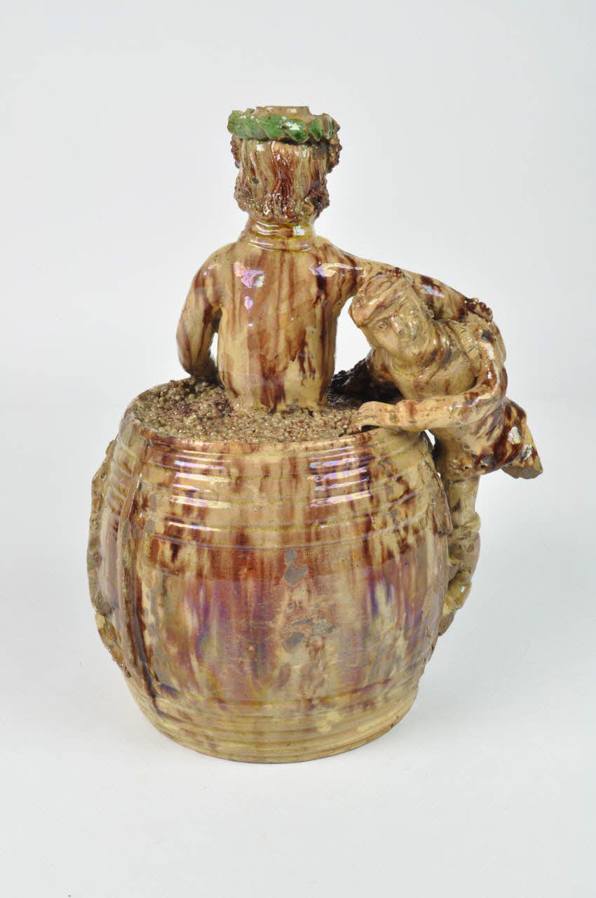 Terre montée au tour avec deux personnages moulés, émaillés et jaspés-marbrés / De forme circulaire, avec une pance galbée correspondant au tonneau; Scène de pressurage de raisins avec le buste d'un homme émergeant du tonneau rempli de raisins tandis qu'un autre apporte une hotte avec du raisin. Une ouverture est présente sur la tête du personnage au centre du tonneau ainsi que sur la partie inférieure de celui-ci.Décor
