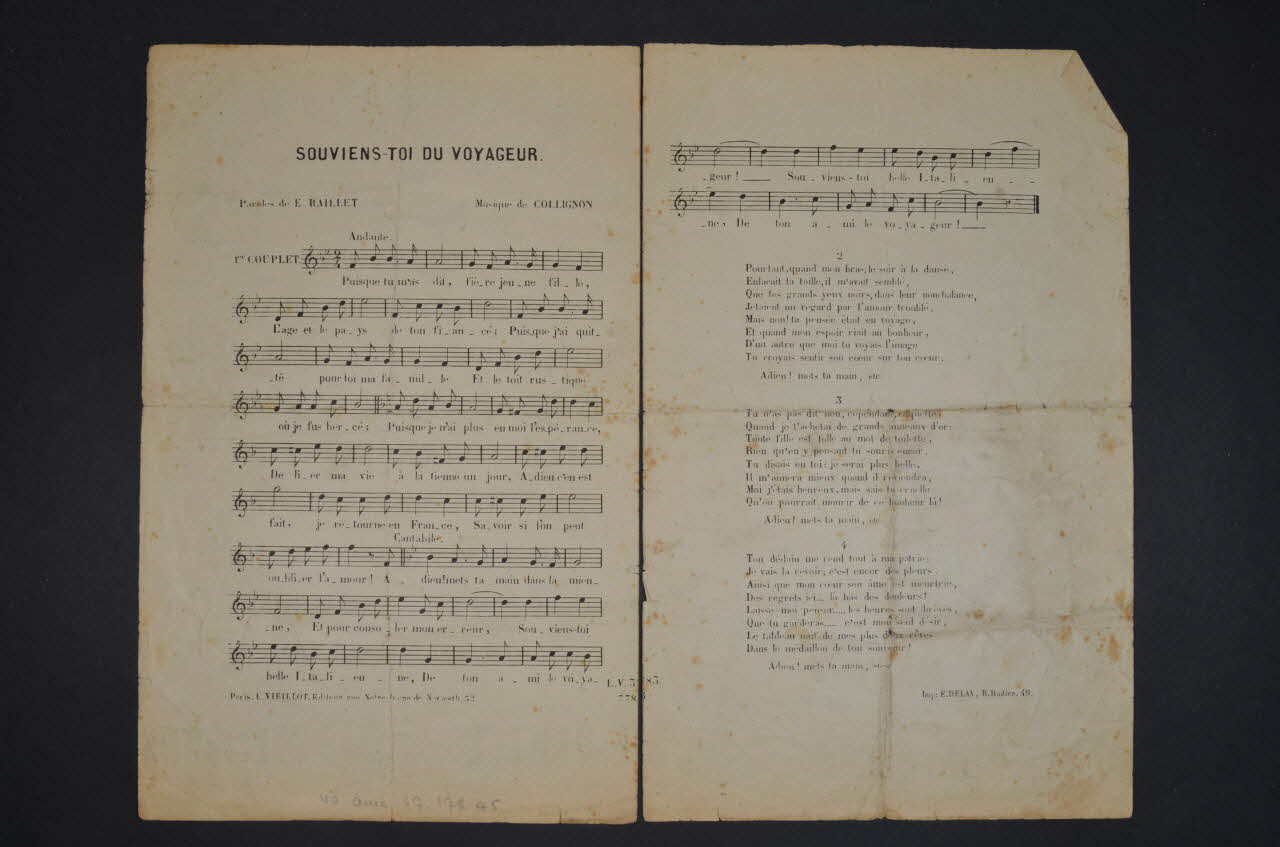 Les inscriptions renseignent le titre de la chanson, le nom des auteurs, de l'artiste et de l'éditeur. A l'intérieur, partitions et paroles de la chanson. Le dos est laissé vierge.Matériaux et techniques