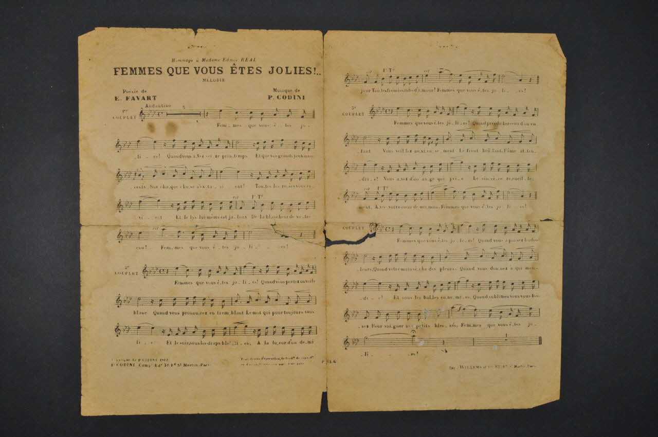 Les inscriptions renseignent le titre de la chanson, le nom des auteurs, de l'artiste et de l'éditeur. A l'intérieur, partitions et paroles de la chanson. Au dos, liste d?autres partitions publiées par l?éditeur.Matériaux et techniques