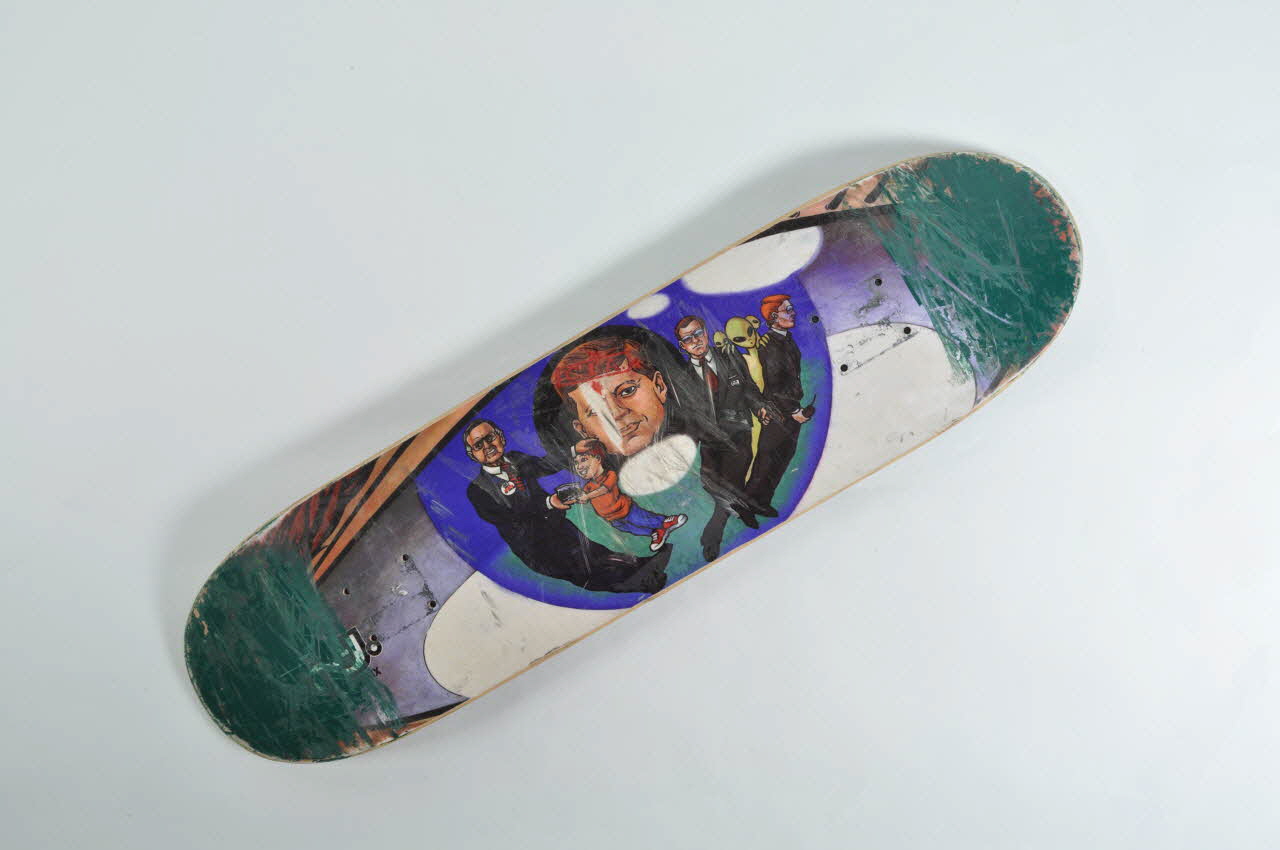 Le décor dessous représente des agents secrets de la CIA en costume accompagnés d'aliens et d'un petit garçon. Ils sont placés devant la tête de John Kennedy. Les deux extrémités du skate sont vertes. Retour pour défauts au distributeur.Décor
