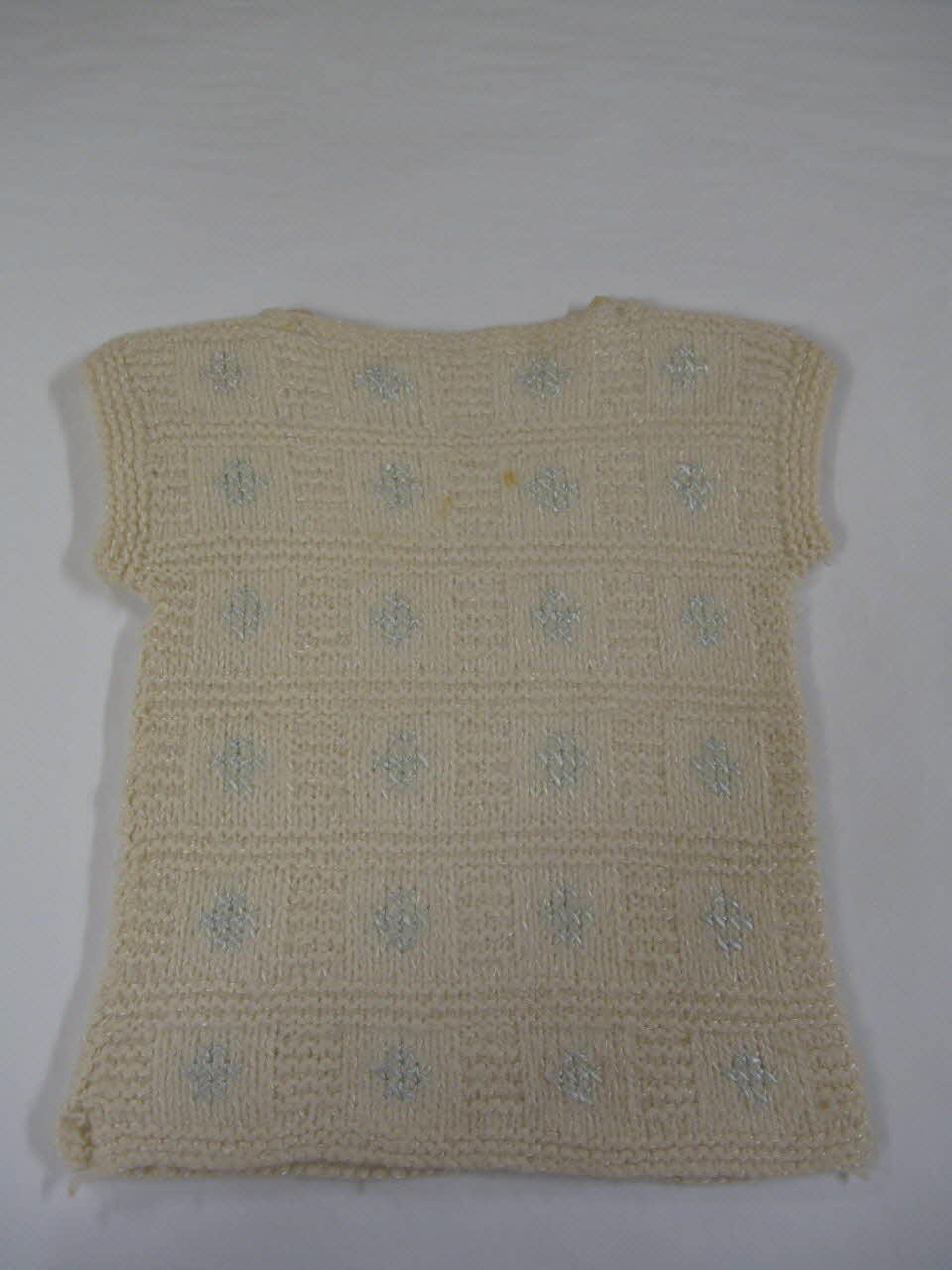 Laine écrue, fils de soie bleue, boutons pression en métal. / Pull-over à manches très courtes tricoté en laine blanche et décoré de points fantaisie réalisés en fils de soie bleue.