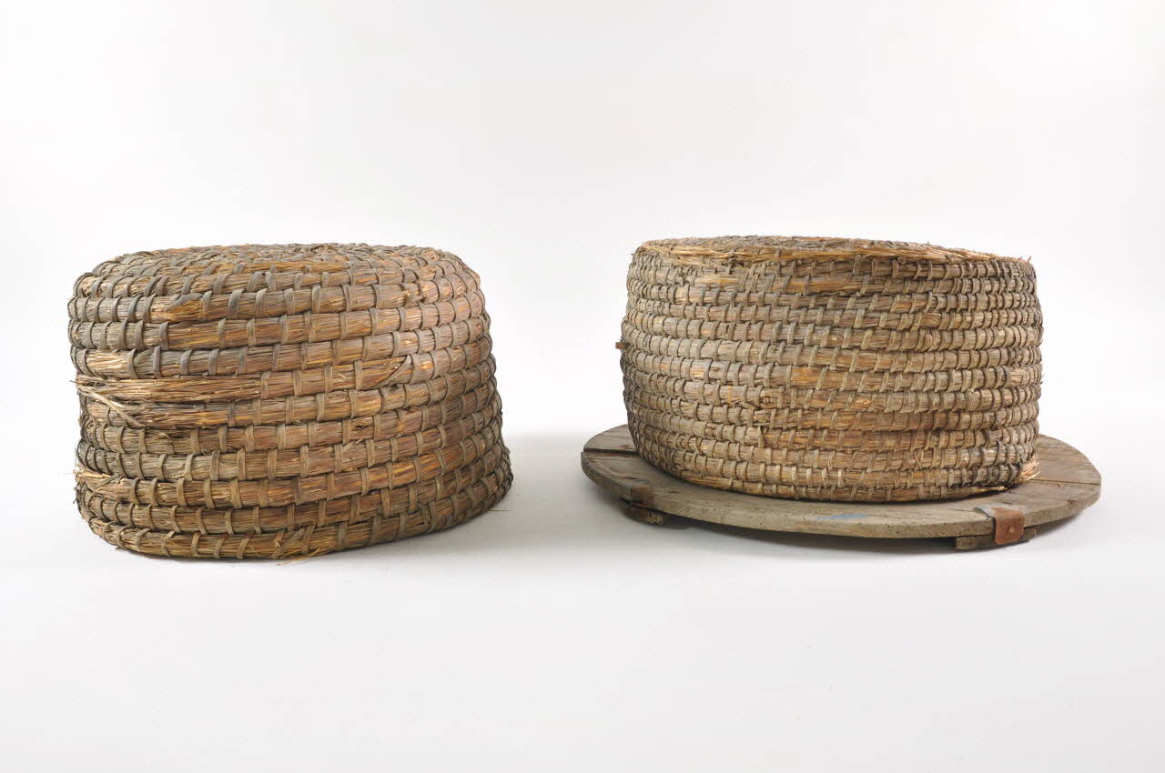 Base de la ruche en bois, de forme circulaire, composée de trois planches clouées sur deux planches perpendiculaires. Un renfort en fer est fixé sur le bord d'une des deux planches.Matériaux et techniques