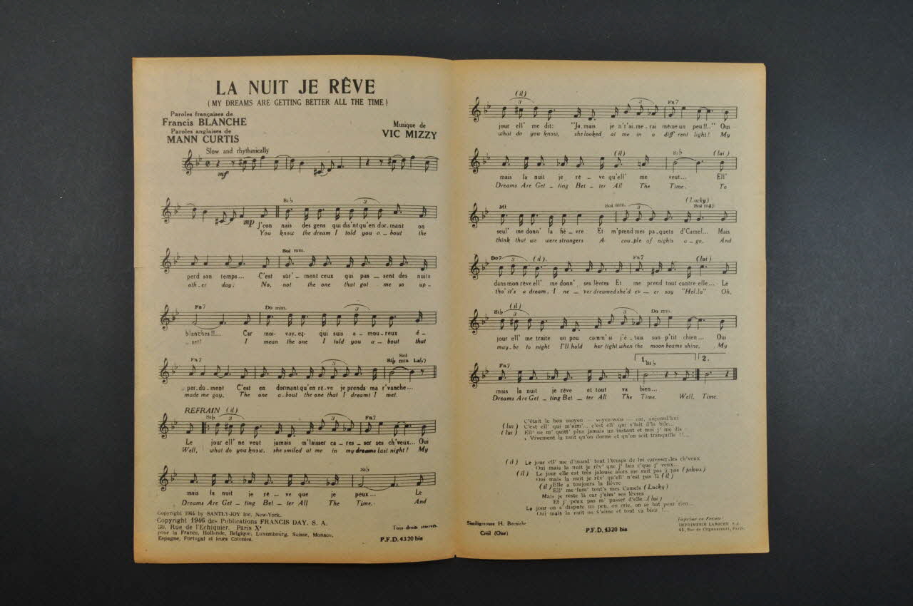 Les inscriptions renseignent le titre de la chanson, le nom des auteurs, de l'artiste et de l'éditeur. A l'intérieur, partitions et paroles de la chanson. Au dos, liste d?autres partitions publiées par l?éditeur.Matériaux et techniques