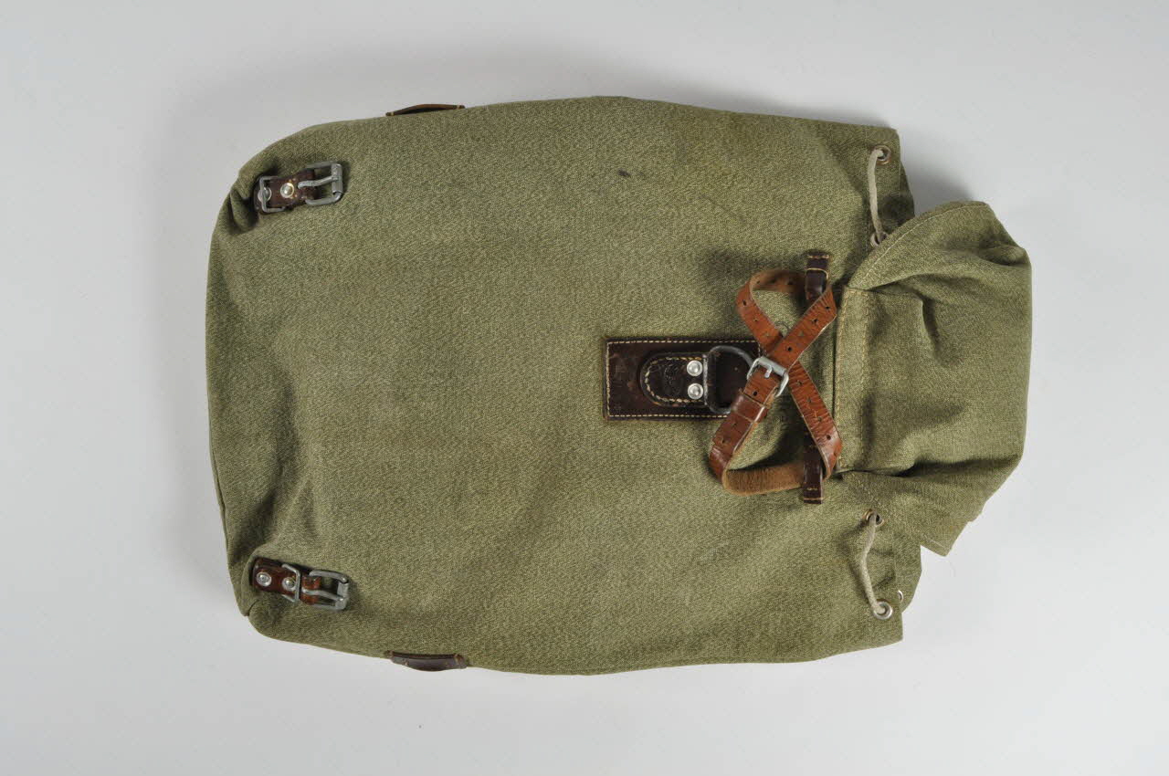 Elément du paquetage, sac de l'armée suisse. En toile de coton verte et écrue, de forme rectangulaire. Fermeture avec un cordon passant par des oeillets métalliques et un rabat s'attachant avec deux brides en cuir marron et en métal. Poche avant avec rabat et deux brides en cuir marron et métal. Anneau métallique sur pièce de cuir au dos. Système d'attache au dos. Inscription en haut du dos.Inscriptions