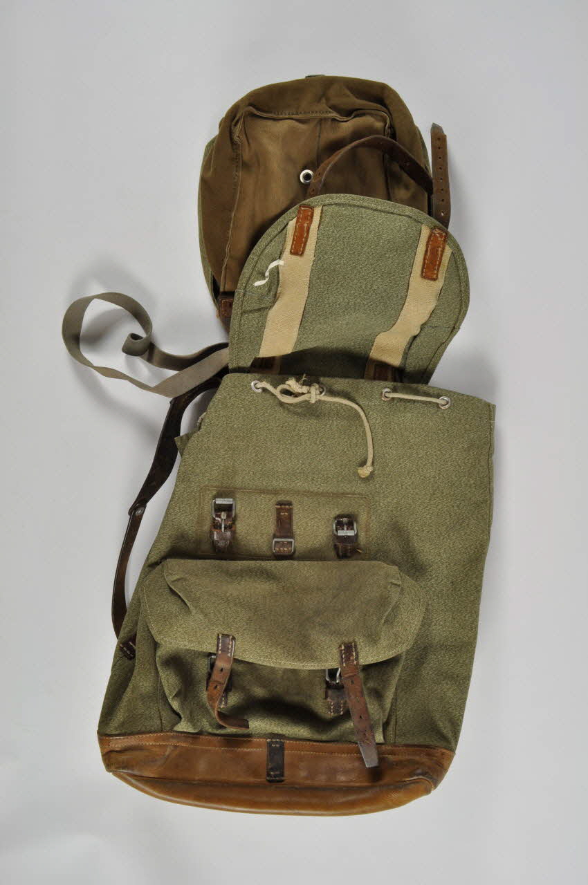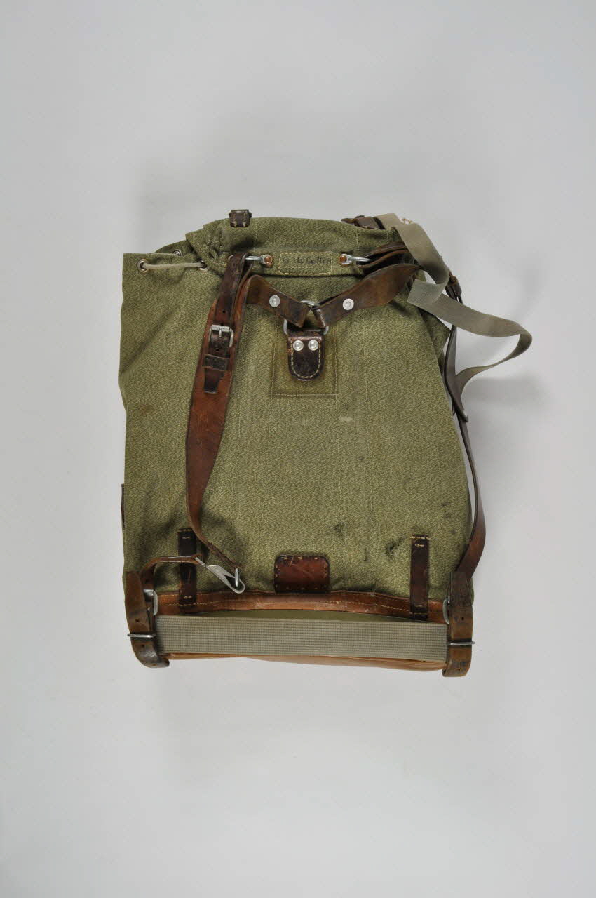 .2 : En toile de coton verte et écrue, de forme rectangulaire. Fermeture avec un cordon passant par des oeillets métalliques et un rabat s'attachant avec deux brides en cuir marron et en métal. Poche avant avec rabat et deux brides en cuir marron et métal. Anneau métallique sur pièce de cuir au dos. Système d'attache au dos, avec anneau métallique et lanières en cuir. Inscription en haut du dos.Inscriptions