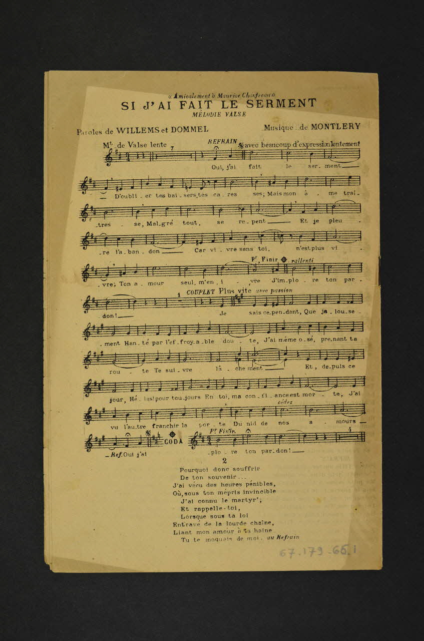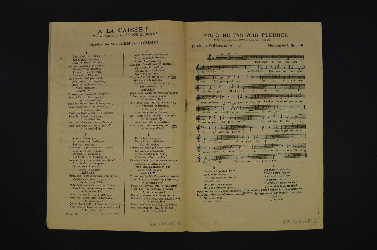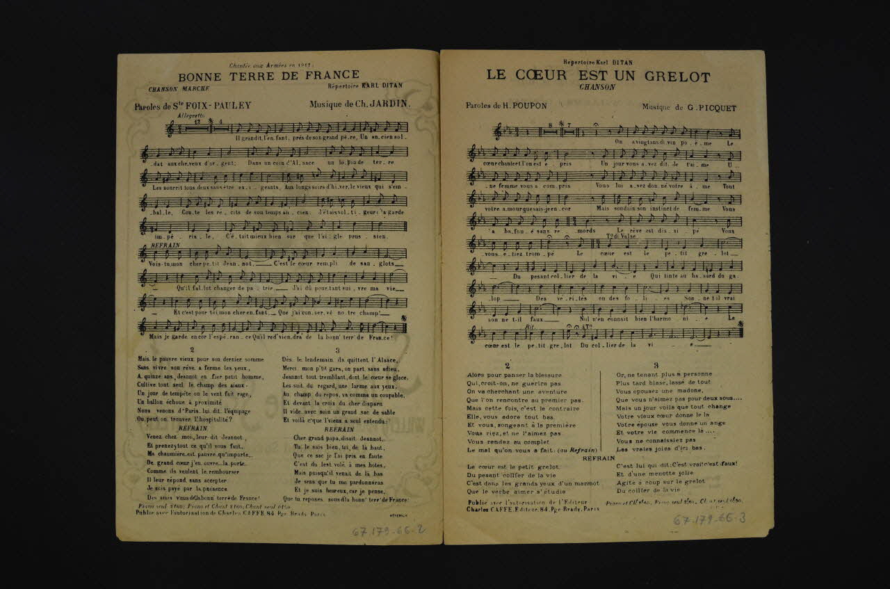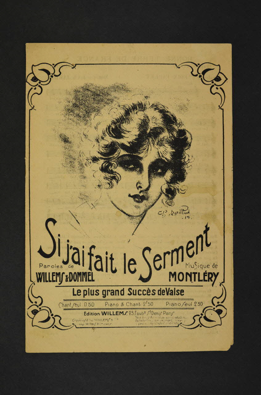Les inscriptions précisent l'auteur de la chanson, les interprètes et l'éditeur du feuillet. L'intérieur et le dos comportent la partition et les paroles.Matériaux et techniques