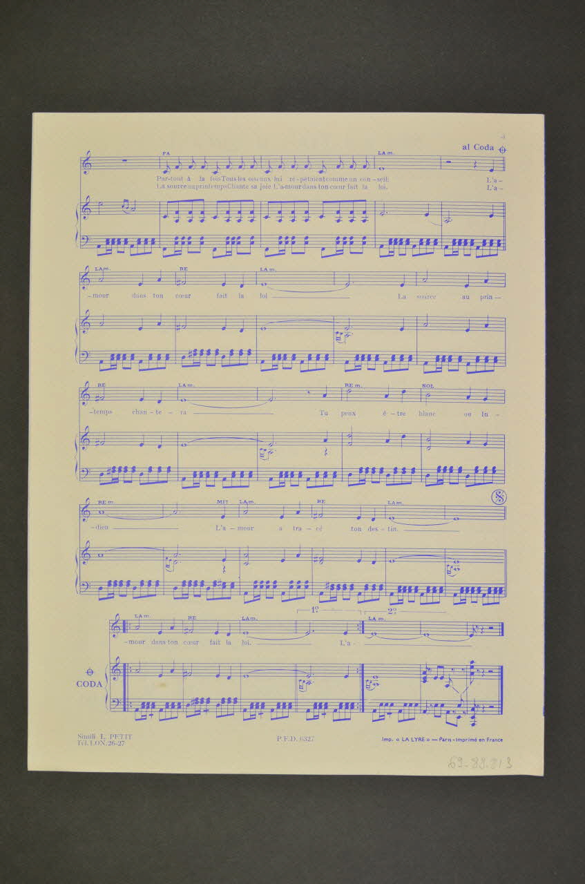 Des inscriptions renseignent le titre, les auteurs, les exécutants et l'éditeur. A l'intérieur et au dos, la partition et les paroles de la chanson.Matériaux et techniques