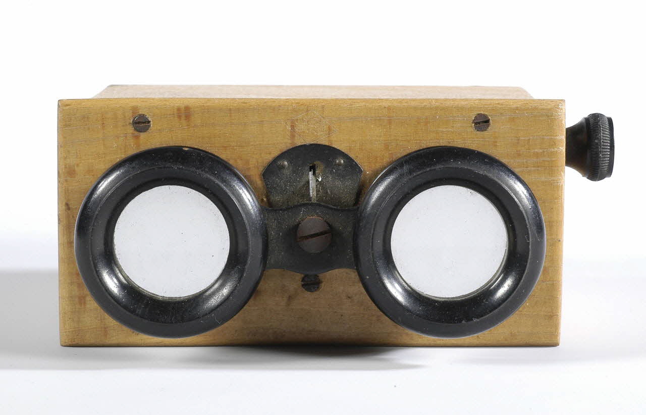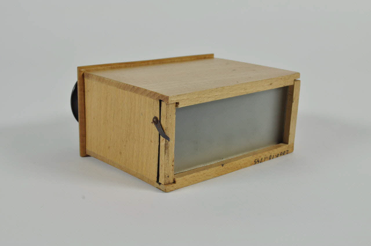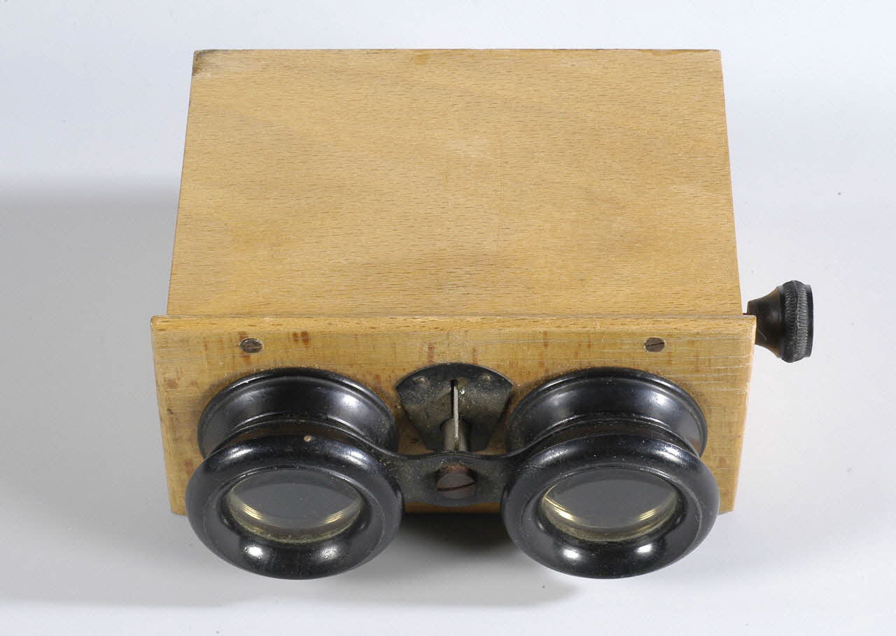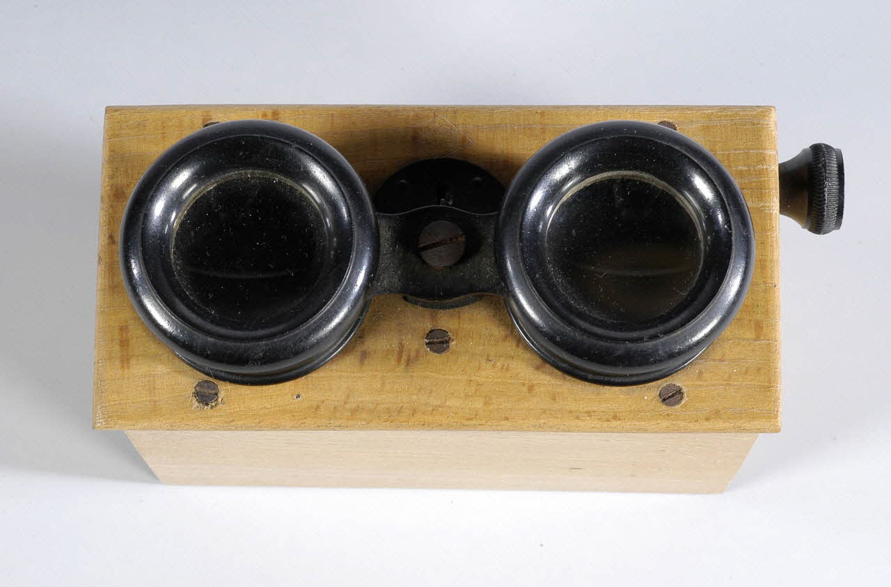 Boîte rectangulaire en bois. Deux oculaires en verre cerclé de métal et un bouton de réglage à une extrémité, une plaque en verre à l'autre extrémité avec deux languettes de fermeture.Matériaux et techniques