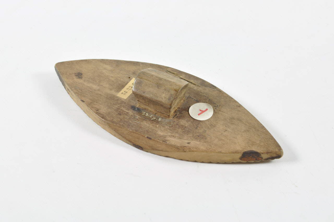Bois gravé à la pointe sèche et au couteau-ciseau / En bois, en forme de lentille, présentant un motif végétal, bordé de hachures, à poignée trapézoïdale.Décor