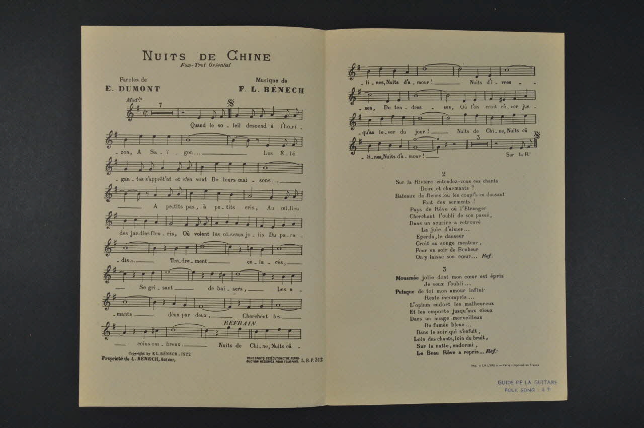 Les inscriptions renseignent le titre de la chanson, le nom des auteurs, de l'artiste et de l'éditeur. A l'intérieur, partitions et paroles de la chanson. Au dos, liste d?autres partitions publiées par l?éditeur.Matériaux et techniques