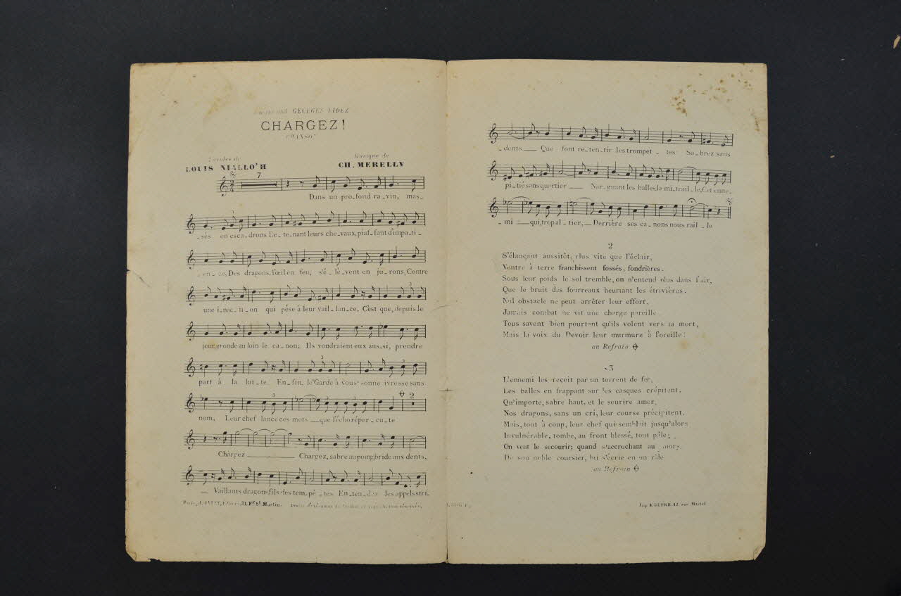 Feuillet rectangulaire imprimé sur papier industriel à l'encre noire. La première page présente le dessin d'une cavalerie chargeant.