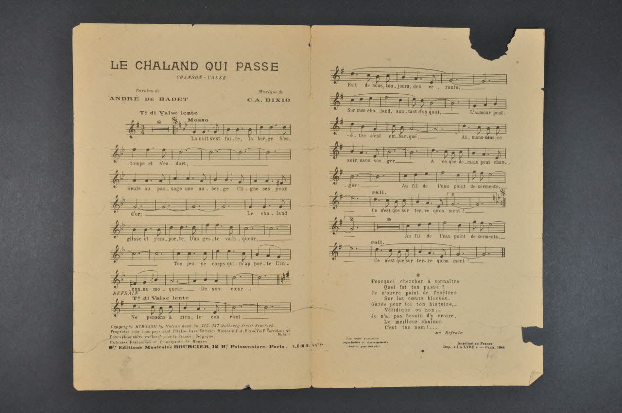 Des inscriptions renseignent le titre, les auteurs, les exécutants et l'éditeur. A l'intérieur, partition et paroles de la chanson. Au dos, liste d'autres partitions publiées par l'éditeur.Matériaux et techniques