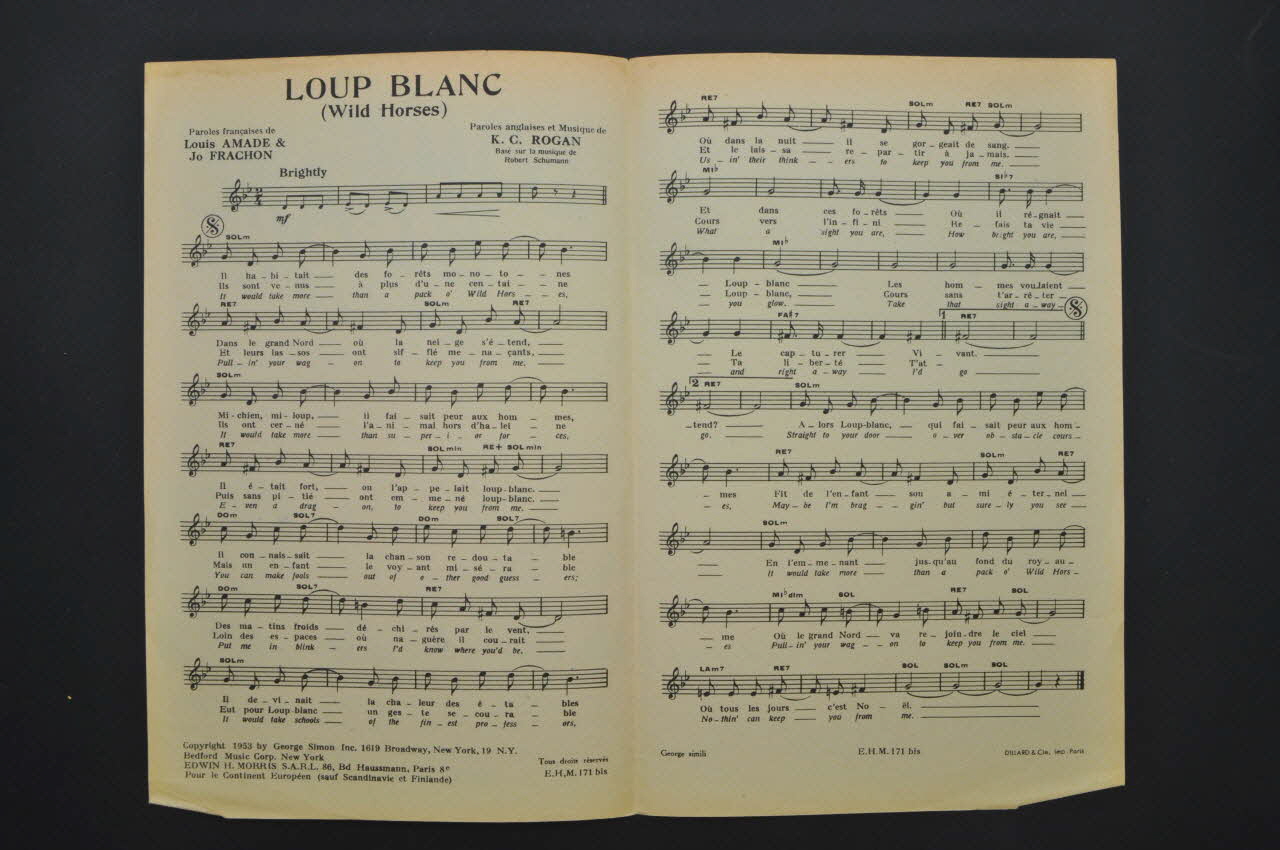 Sur la couverture, les portraits photographiques de Patrice et Mario, Raymond Legrand et John William. Les inscriptions renseignent le titre de la chanson, le nom des auteurs, des artistes et de l'éditeur. A l'intérieur, partition et paroles bilingues de la chanson. Au dos, liste d'autres partitions publiées par l'éditeur.Matériaux et techniques