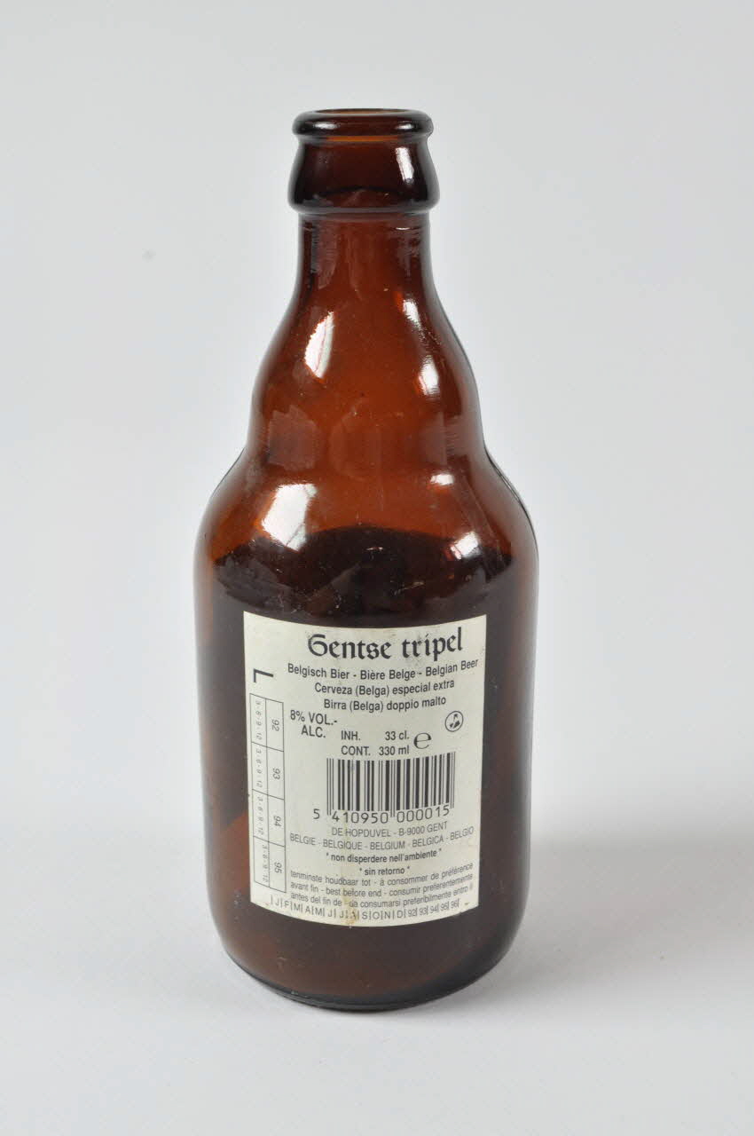 Gentse tripel / Bière Belge / 8% VOL. - ALC. / INHH. 33cl. / CONT. 330ml e / DE HOPDUVEL - B 9000 GENT / BELGIQUE / *non disperdere nell'ambiente* / *sin retorno* / à consommer de préférence / avant fin (Lorsque les indications en français sont traduites en d'autres langues sur la bouteille, seul le français est transcrit.), dosMatériaux et techniques