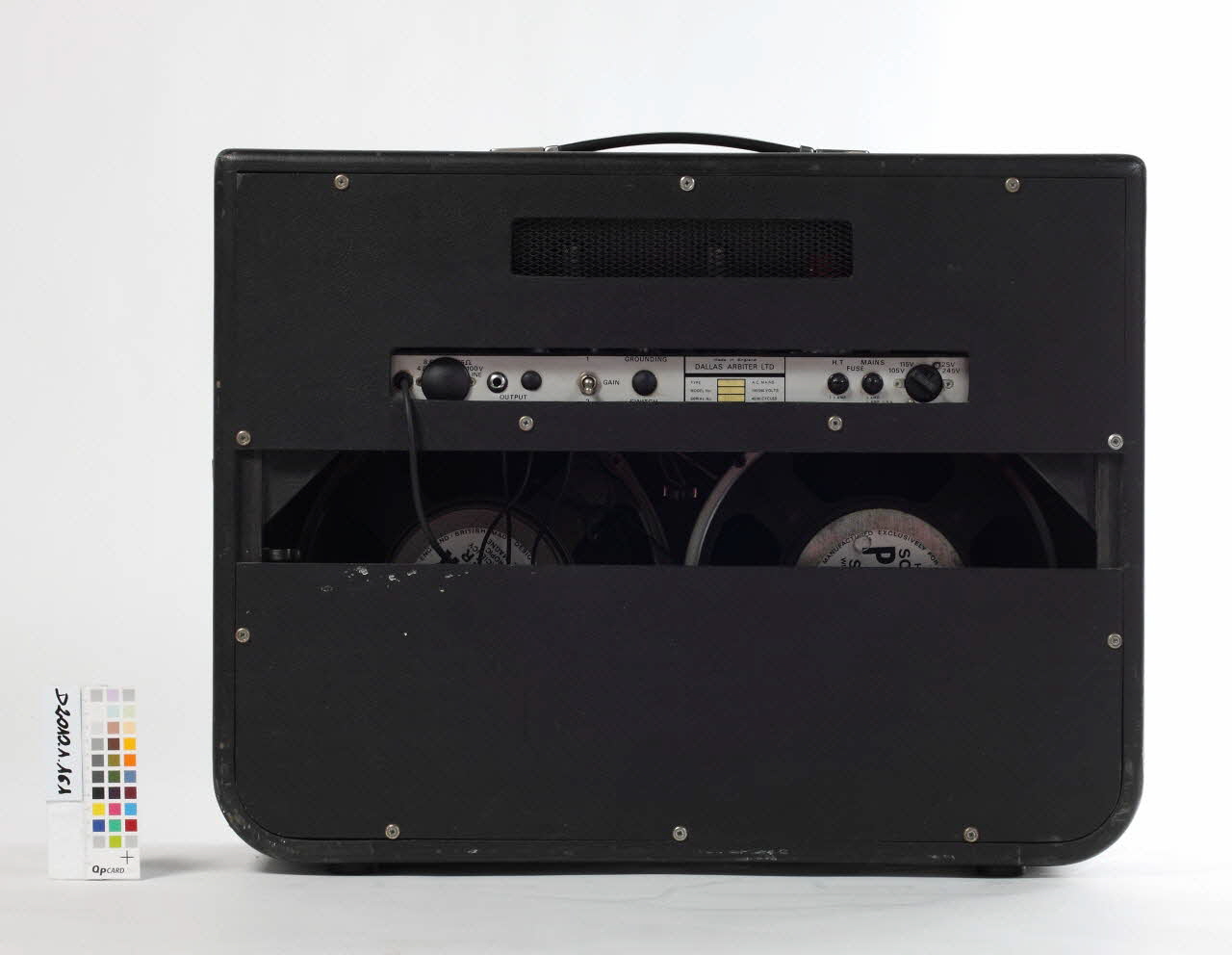 Sound-City, devanttype MK4 // Model CCD // n° série 1308 // DALLAS ARBITER (nom de la société qui fabrique les amplificateurs), dosPaul Beuscher (distributeur et importateur de la marque pour la France - donnait des amplificateurs et en contrepartie son nom figurait sur l'objet), devantDécor