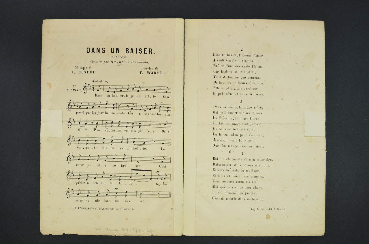 Les inscriptions précisent l'auteur de la chanson, les interprètes et l'éditeur du feuillet. L'intérieur comporte la partition et les paroles. Le dos est laissé vierge.Matériaux et techniques