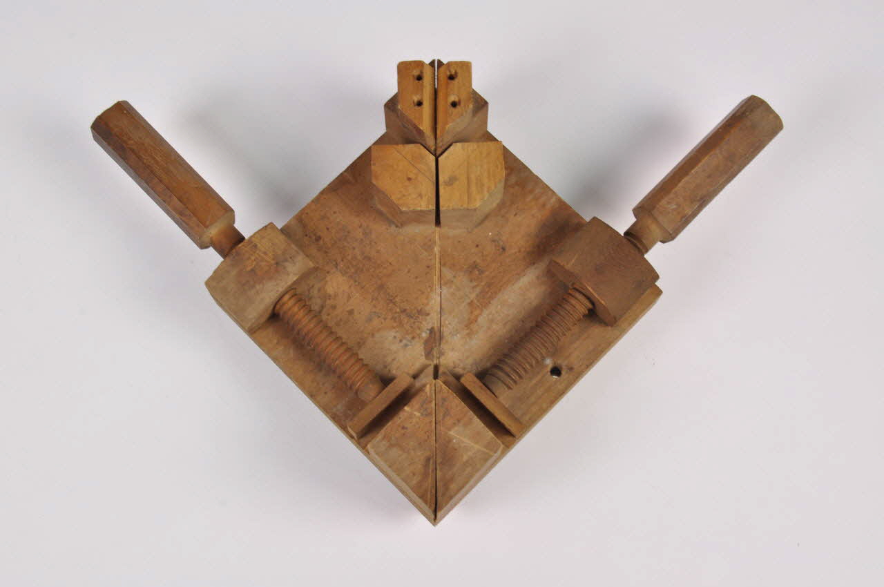 Ce serre-joint d'encadreur est constitué de deux pas de vis perpendiculaires fixés sur un support carré, reposant sur trois petits pieds.Matériaux et techniques