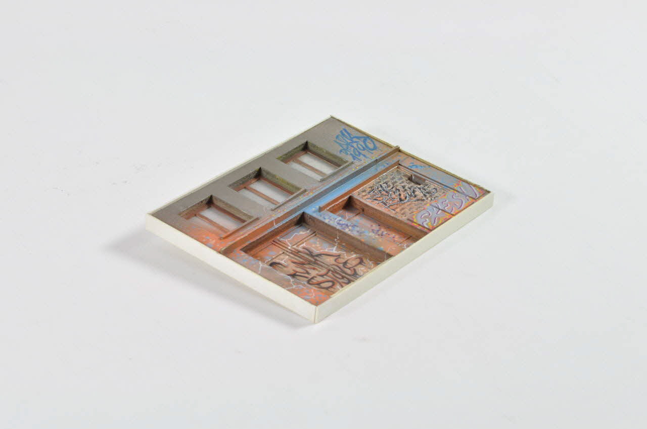 Le mur, lisse, est percé de trois fenêtres en partie supérieure, de deux portes et d'une fenêtre murée en partie inférieure. Le mur, peint en brun, présente des tags de différentes couleurs. Des attaches métalliques sont fixées au revers de l'objet.Matériaux et techniques