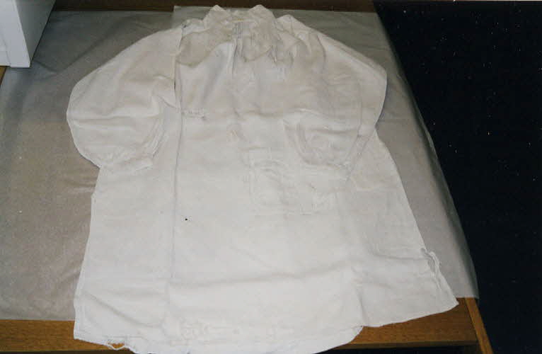 Toile de chanvre blanche / Encolure ronde, col rond, ouverture partant de l'encolure, manches longues et amples, fronces verticales.Matériaux et techniques