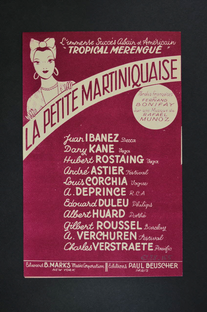 Sur la couverture, en haut à gauche; représentation d'une femme en buste en costume martiniquais ; au-dessous, silhouettes de couples dansant. Les inscriptions renseignent le titre de la chanson, le nom des auteurs, des artistes et de l'éditeur. A l'intérieur, partition et paroles de la chanson. Au dos, liste d'autres interprètes de la chanson et en haut à gauche, même représentation de martiniquaise que sur la couverture.Matériaux et techniques