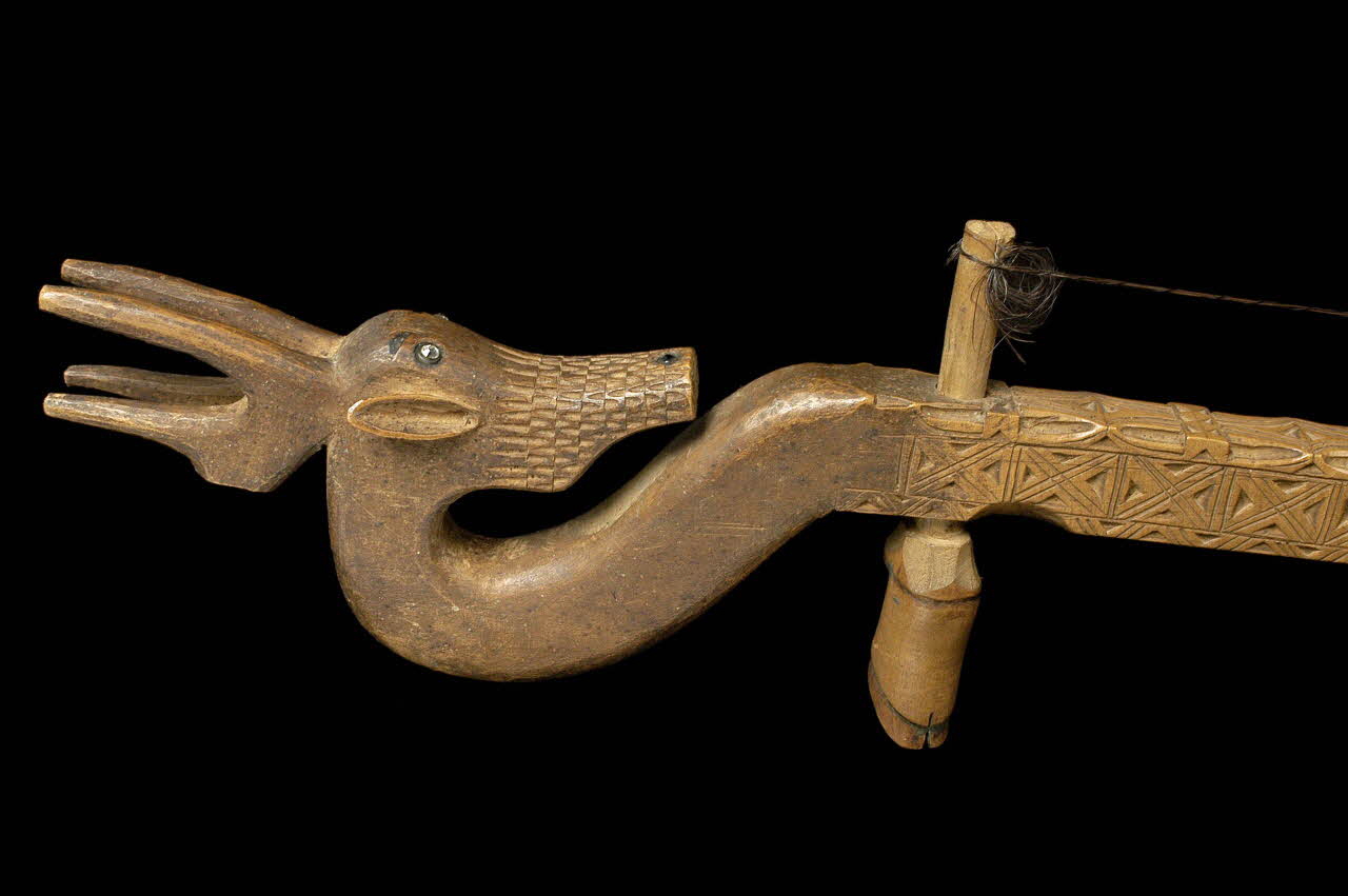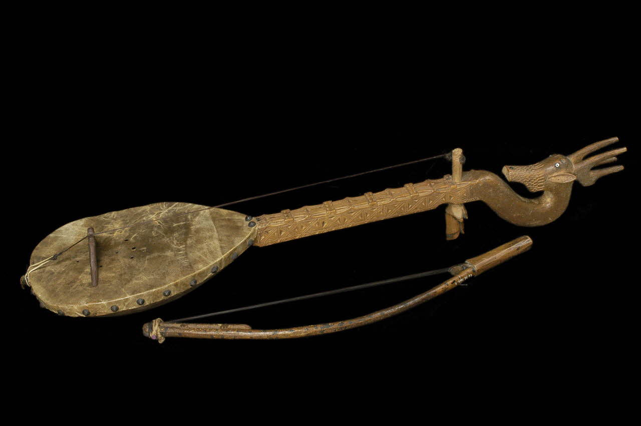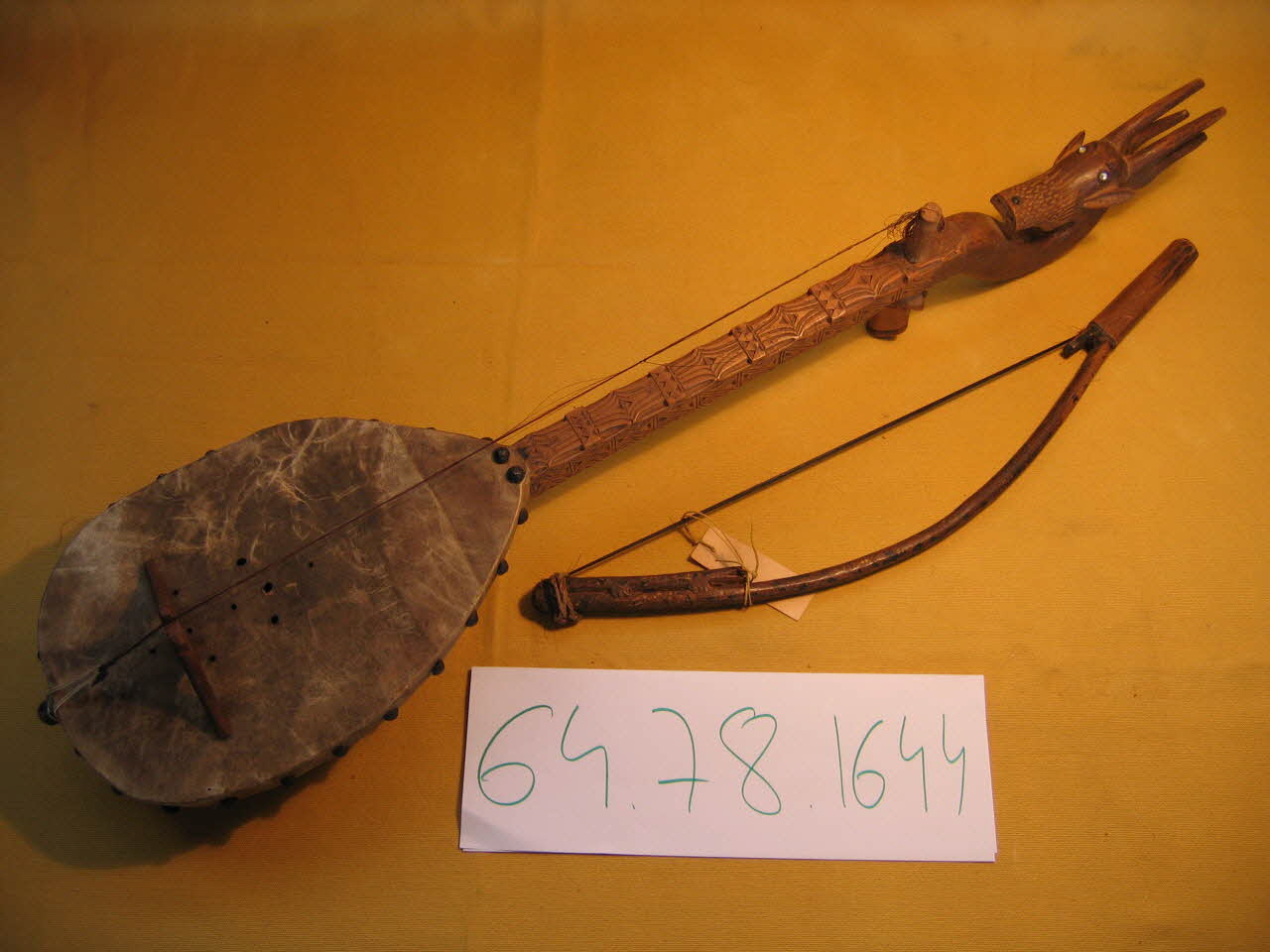 vièle monocorde à table d'harmonie en peau cloutée autour de la caisse faite dans un bloc de bois creusé, avec un manche taillé dans le prolongement de la caisse et terminé par une tête animale (un cervidé probablement), sculptée et décorée (les yeux notamment sont fait par deux faux diamants collés, et la cheville de la corde représente le sabot de la patte de l'animal).
