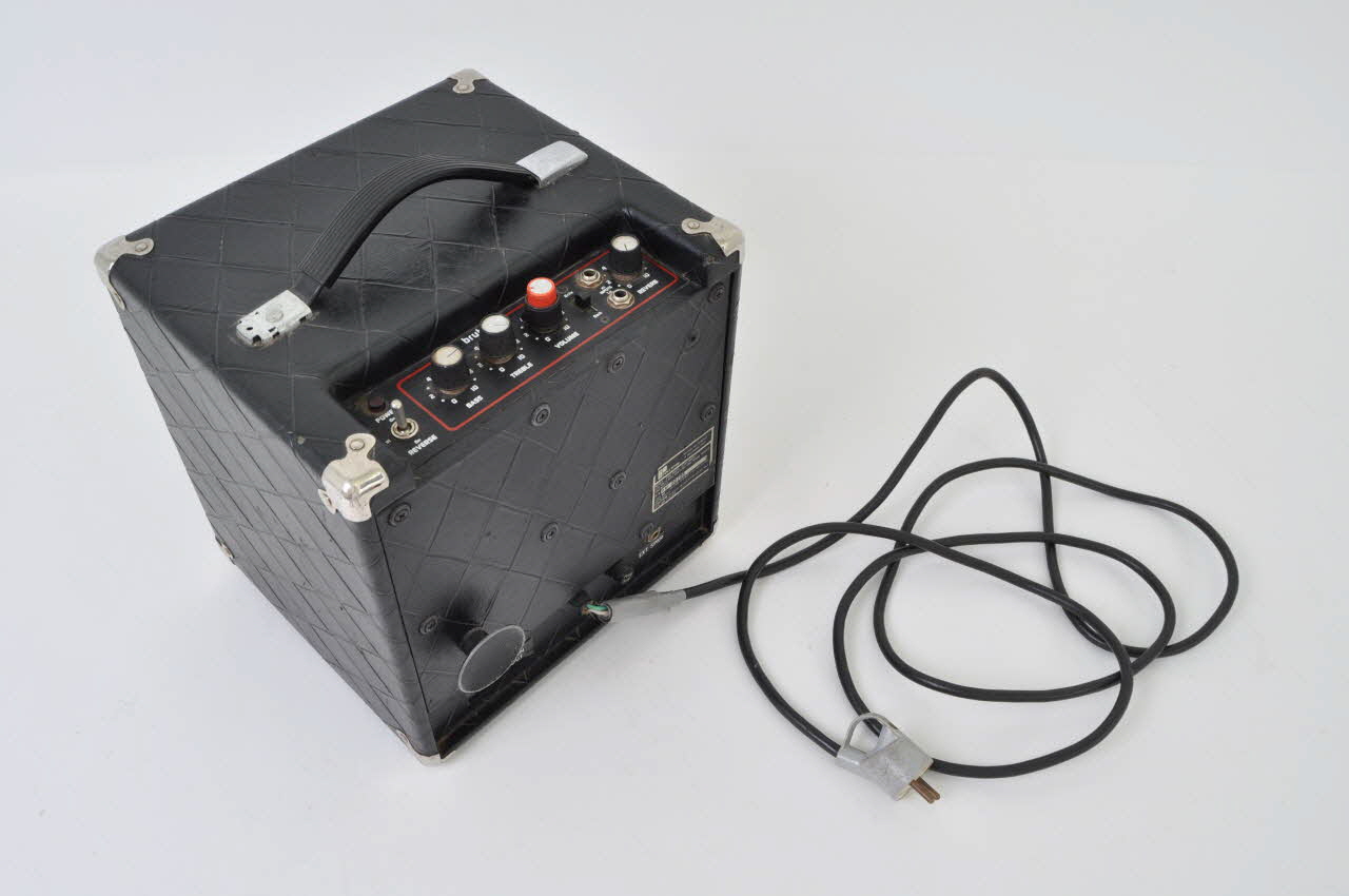Le contenant est constitué de planches de bois peintes en noir, recouvertes sur cinq faces d'un plastique imitant un cuir noir à motif de losanges gaufrés. Les coins sont renforcés par de petites plaques de métal argenté clouées. Une poignée en plastique noir rainuré est présente sur le dessus au centre. Un évidement dans la face supérieure, le long du bord arrière, accueille des boutons de réglage : un interrupteur de contact, quatre potentiomètres, deux entrées jack, un bouton pressoir de présélection, un bouton de préamplificateur rouge concentrique au-dessus du bouton de volume. La face avant présente un léger retrait, accueillant une paroi sphérique noire, et recouvert par de la mousse noire. En bas de la face arrière sont logés de gauche à droite : deux entrées jack, un fil d'alimentation terminé par une prise en plastique gris, un bouton de réglage et une autre entrée. Un élément sphérique en plastique noir ressort vers le bas à gauche. Une petite plaque de métal (.2) de forme rectangulaire accompagne l'objet. Elle devait être fixée sur la mousse à l'avant du caisson. Elle présente sur son recto des inscriptions en relief se détachant sur un fond noir. Deux picots sortent du revers.Inscriptions