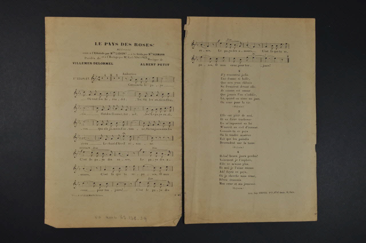 Les inscriptions renseignent le titre de la chanson, le nom des auteurs, de l'artiste et de l'éditeur. L'intérieur contient la partition et les paroles. Le dos est laissé vierge.Matériaux et techniques