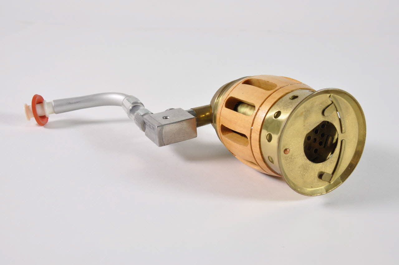 Cet enfumoir possède l'aspect d'un tonnelet dont la partie inférieure se poursuit sous la forme d'un conduit métallique. La partie principale est en cuivre, percée de trous dans la partie haute et disposant d'un tube creux dans le bas. Le sommet de ce tonnelet présente deux fentes dans le cuivre, chacune munie d'une petite languette. Celle-ci permet la fermeture de l'enfumoir. A l'intérieur de ce tonnelet on distingue une plaque de métal doré percée de trous et maintenue par des crochets métalliques rectangulaires et recourbés. La panse du tonnelet est recouverte de bois clair percé de formes oblongues et verticales. Deux lignes sont incisées dans le haut et le bas du bois et en constituent le décor. Le conduit métallique possède une forme en "L" et se compose de divers éléments mis bout à bout : une pièce en métal blanc rectangulaire et comportant une molette fixe dans le bas ; un tube en plastique transparent maintenu par deux accroches extérieures ; un tube métallique légèrement plié ; un embout en plastique blanc ; une rondelle en caoutchouc rouge, percé et enfilé sur cet embout. Cet enfumoir servait pour le tabac.Matériaux et techniques